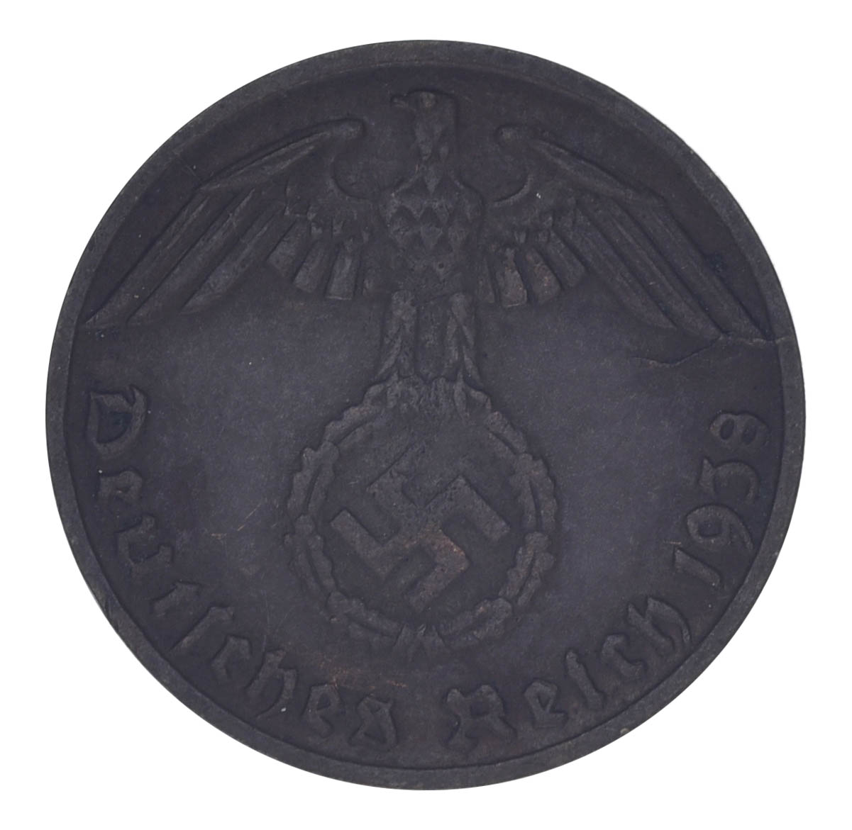 На аверсе — национальный орёл Третьего рейха с распростёртыми крыльями, стоящий на венке из дубовых листьев, в центре венка — символ нацистской партии и государства. Сверху по дуге надпись «DEUTSCHES REICH», снизу год «1938». Дизайн типичен для бронзовых мелких номиналов 1936–1940 годов.