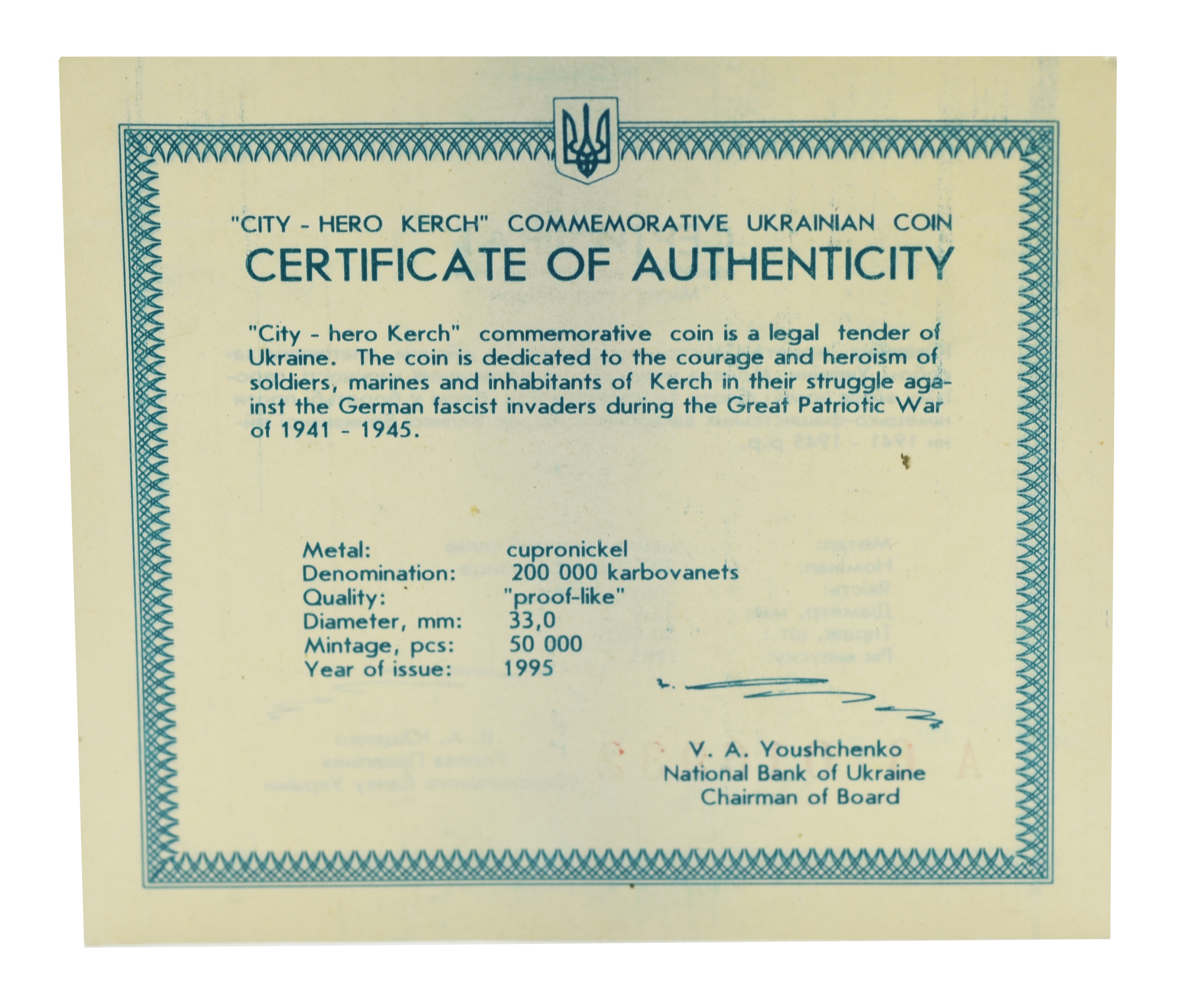 Сертификат для монеты Украины 200000 карбованцев 1995 «Город герой Керчь»