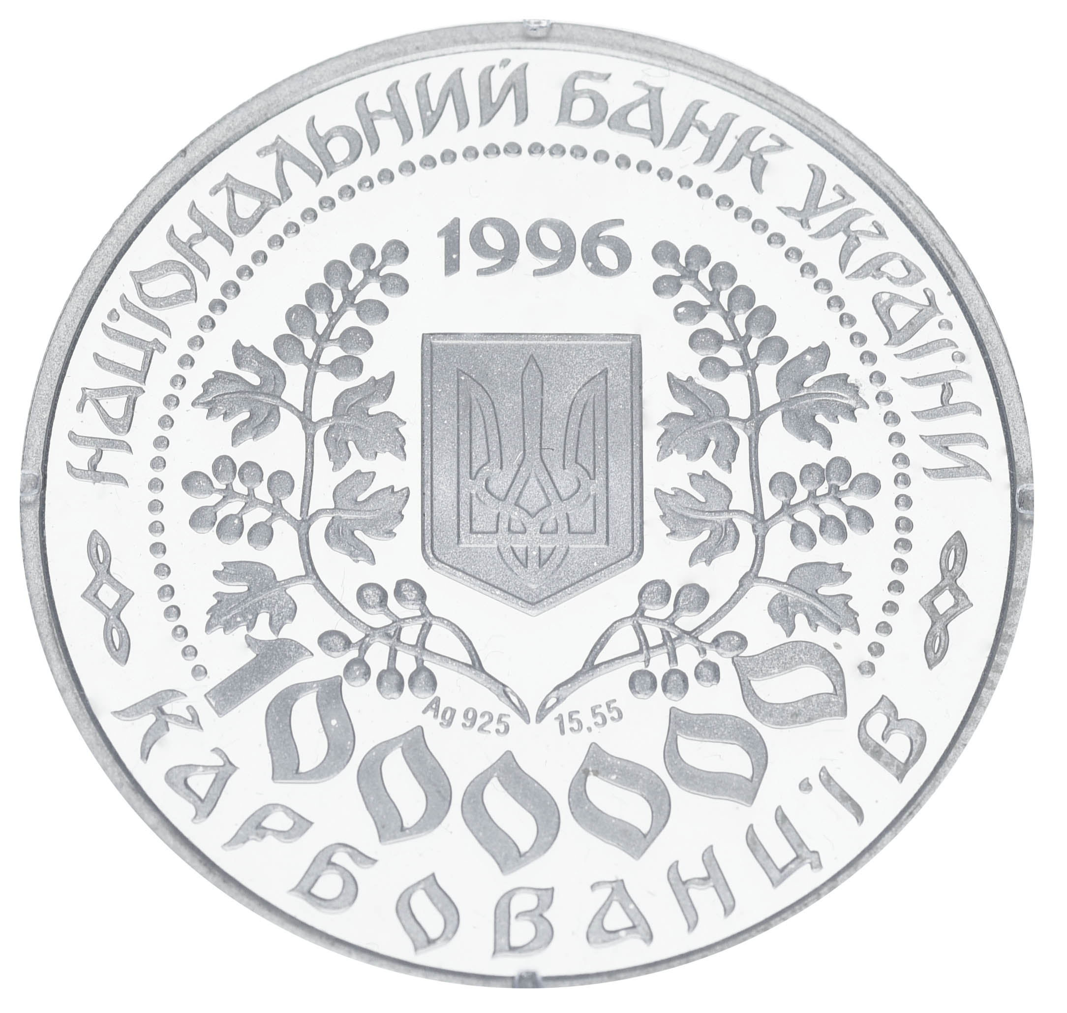 На аверсе монеты в центре круга, образованного ожерельем, находится изображение малого Государственного герба Украины в обрамлении с двух сторон ветвями калины. Над гербом размещена дата 1996 – год чеканки монеты. По кругу монеты надписи: вверху НАЦИОНАЛЬНЫЙ БАНК УКРАИНЫ, 1000000 КРАШЕНЦЕВ. Под ветвями калины расположены обозначение и проба драгоценного металла Аg 925 и его вес в чистоте 15,55