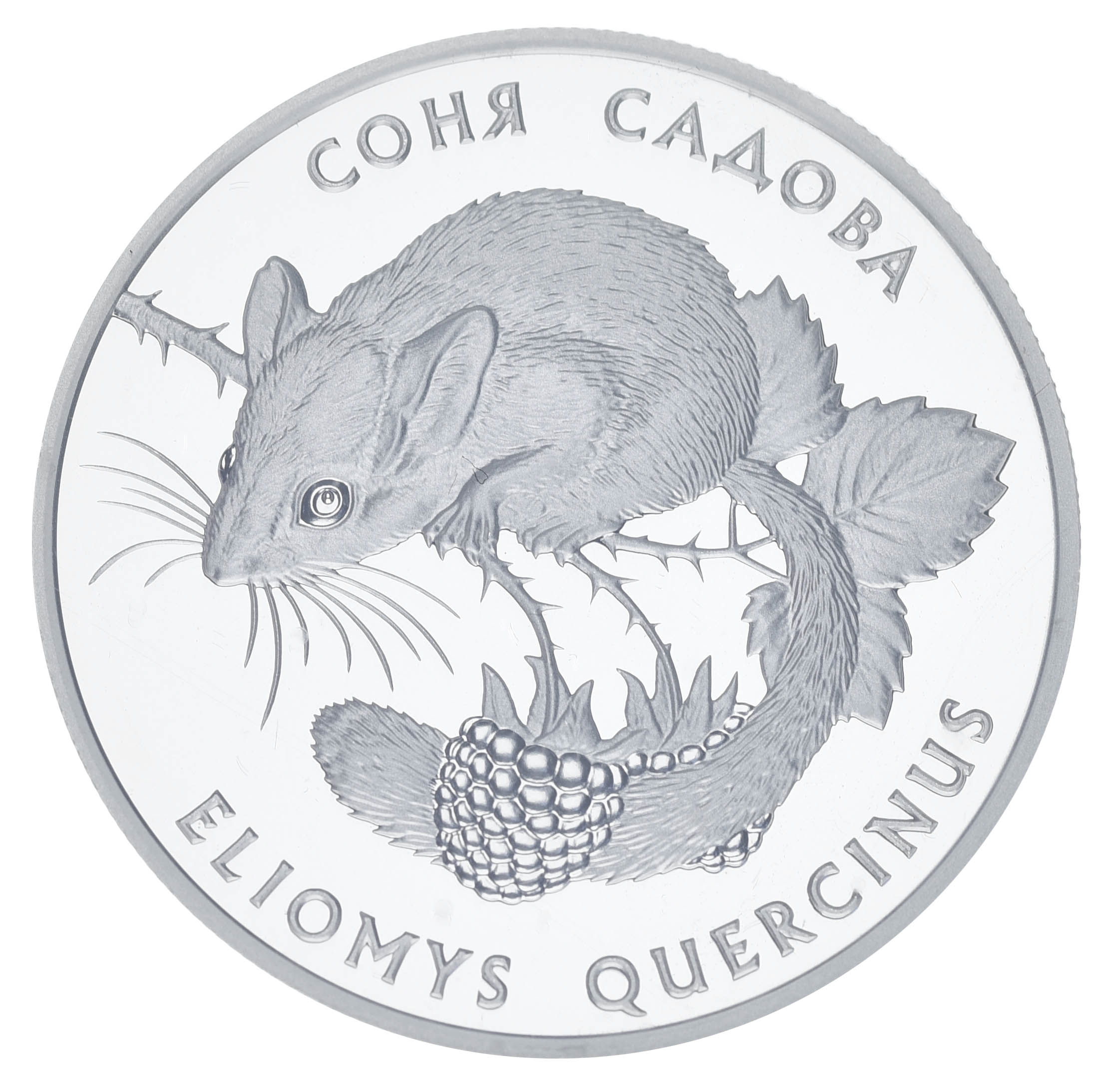 На реверсе монеты изображены садовую соню на малиновой веточке, вокруг - надписи: СОНЯ САДОВАЯ и ELIOMYS QUERCINUS.