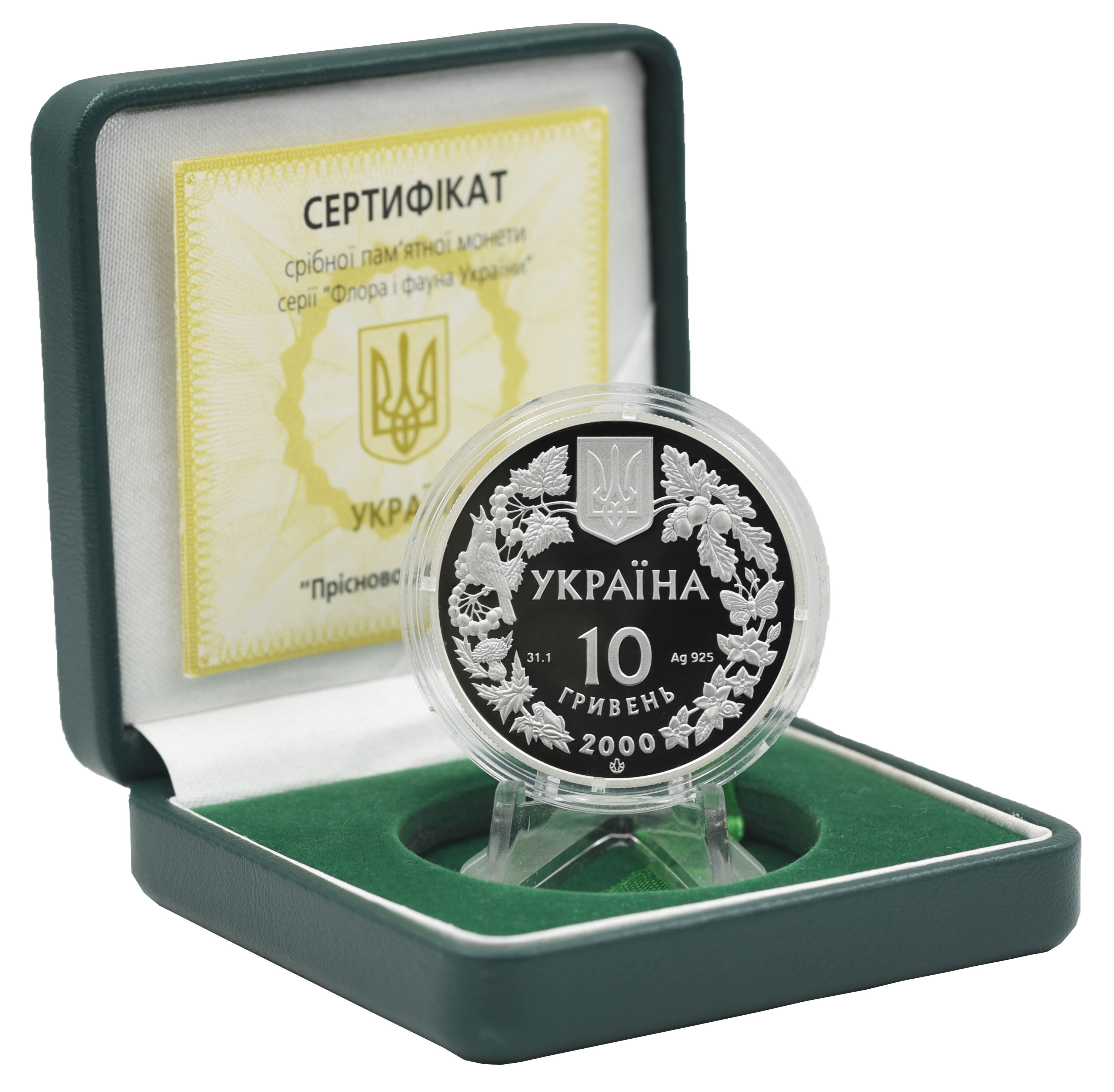 На аверсе монет в обрамлении венка, образованного из изображений отдельных видов флоры и фауны, размещен малый Государственный герб Украины, логотип Монетного двора и надписи: На монете из серебра -УКРАИНА / 10 / ГРИВЕН / 2000 и обозначение металла Ag 925, вес чист 31,1.