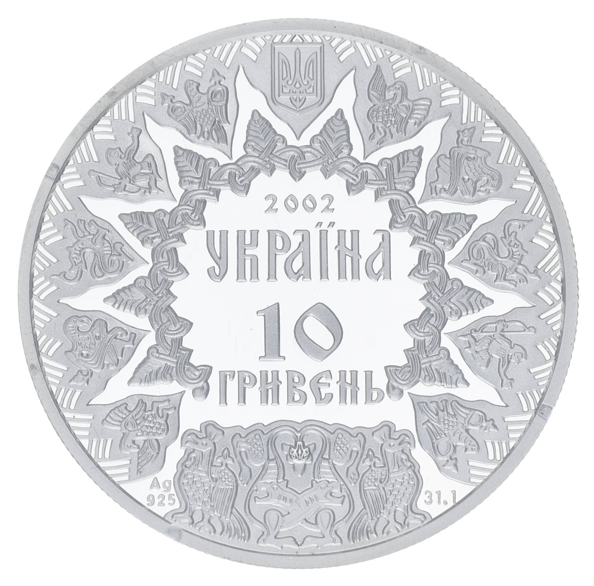 На аверсе монеты в обрамлении древнерусского орнамента, воспроизведенного по мотивам изображений на венце ритуального туристического рога из черниговского кургана Черная Могила (Х ст.), размещен малый Государственный Герб Украины и стилизованные надписи: 2002, УКРАИНА, 10 , обозначение металла, его пробы - Ag 925 и вес в чистоте - 31,1