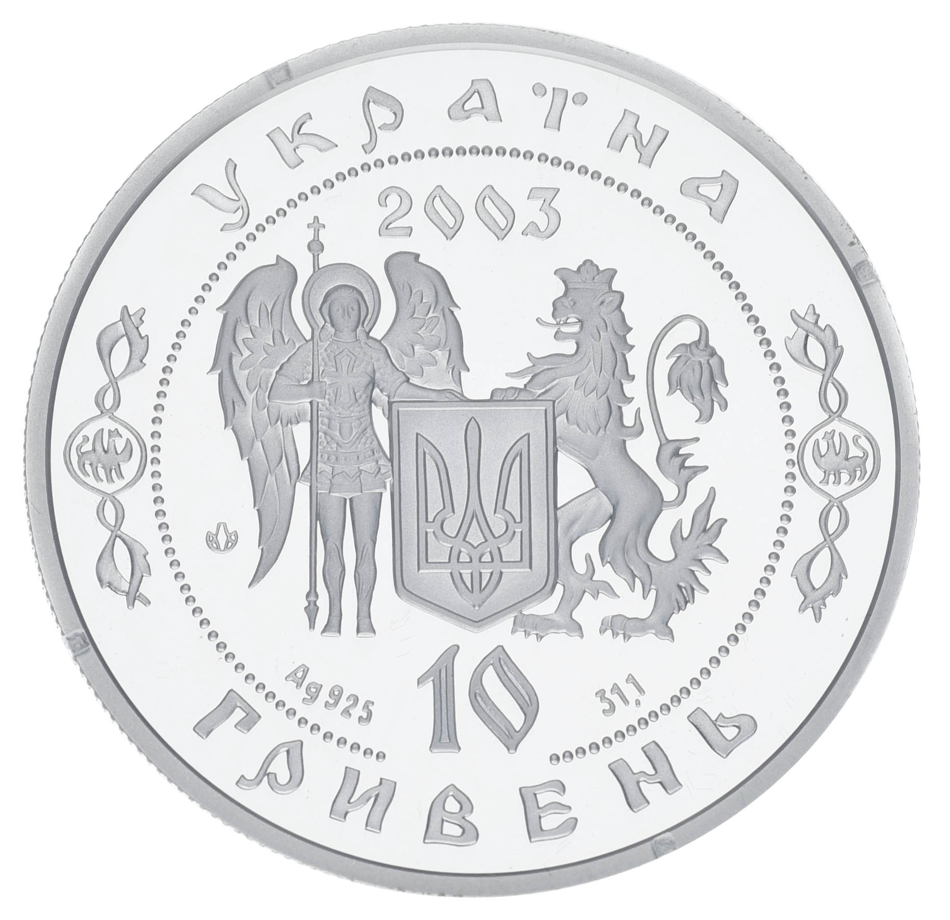 На аверсе монеты изображена общая для этой серии композиция, воплощающая идею соборности Украины: малый Государственный Герб Украины поддерживают гербовые фигуры архистратига Михаила и коронованного льва - символы городов Киева и Львова, стилизованные надписи: УКРАИНА, 2003, 10, а также обозначение металла, его проба – Ag 925 и вес в чистоте – 31,1.