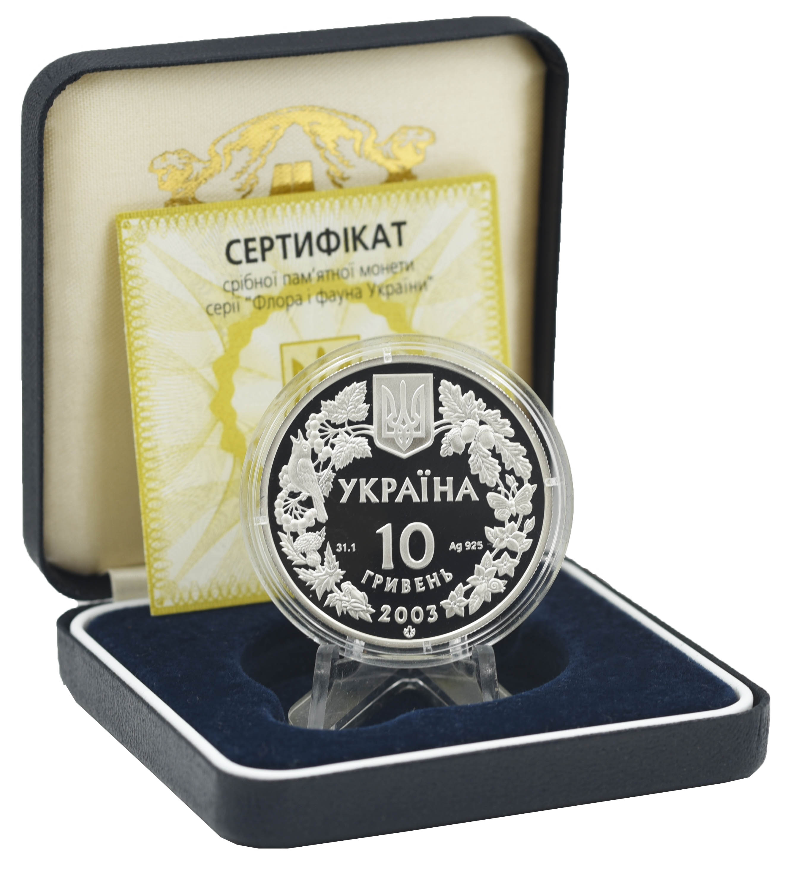 На аверсе монеты в обрамлении венка, образованного из изображений отдельных видов флоры и фауны, 1 размещен малый Государственный Герб Украины и надписи в четыре строки: на монете из серебра – УКРАИНА, 10 ГРИВЕНЬ, 2003, а также обозначение металла и его пробы – Ag 92 вес в чистоте – 31,1 и логотип Монетного двора Национального банка Украины