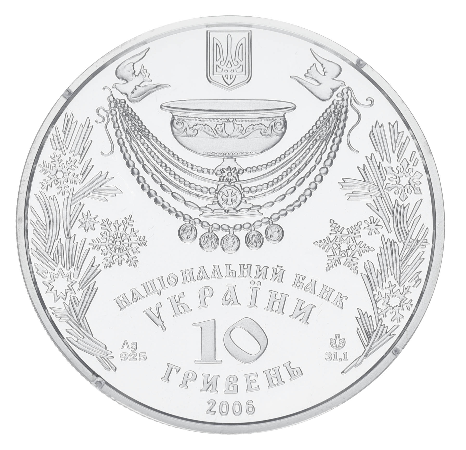 На аверсе монеты изображена композиция из церковной чаши и украинских женских украшений, которые держат голуби, над ней – малый Государственный Герб Украины; под композицией размещены надписи: НАЦИОНАЛЬНЫЙ БАНК/ УКРАИНЫ/ 10/ ГРИВЕН/ 2006, обозначение металла и его пробы – Ag 925, вес в чистоте – 31,1; слева и справа размещены стилизованные ледяные ветки с льдинками, а также логотип Монетного двора Национального банка Украины.