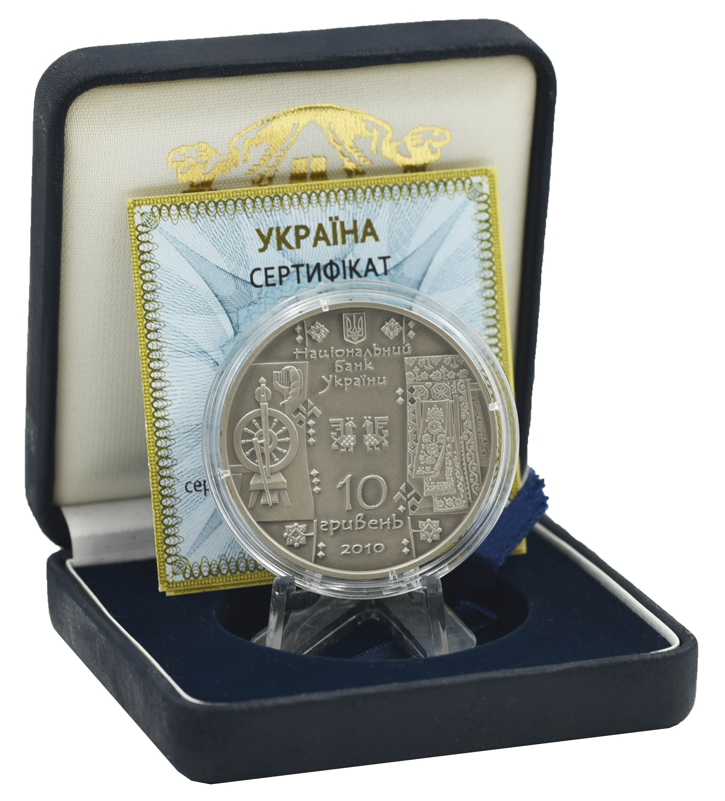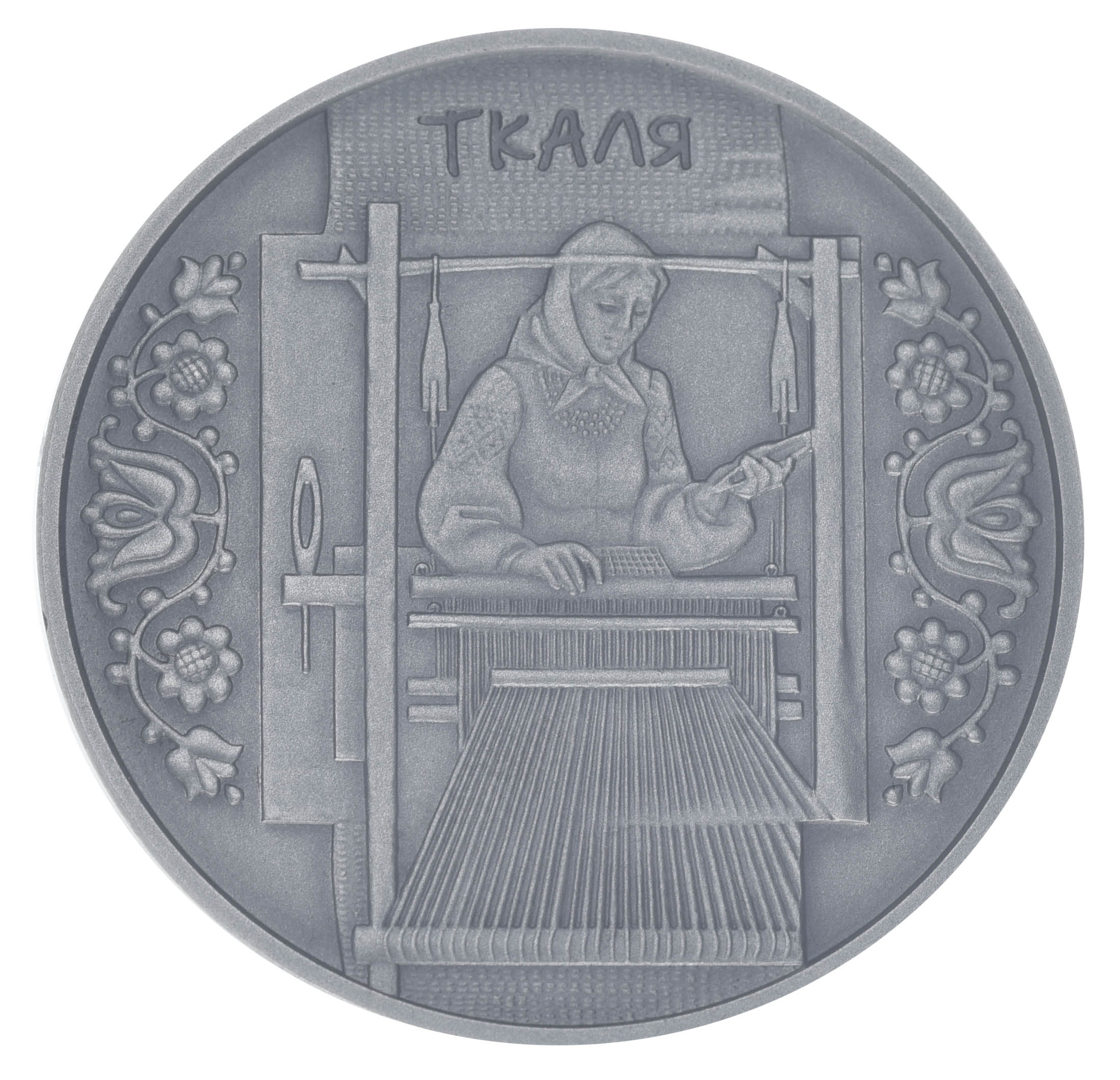 Присвячена одному з найважливіших видів господарської діяльності та мистецької культури українців, що був невід`ємною частиною домашніх занять кожної селянської сім`ї - ткацтву. З давніх часів на території України займалися обробленням волокна з льону, конопель і вовни. Монету виготовлено з використанням технології патинування.
