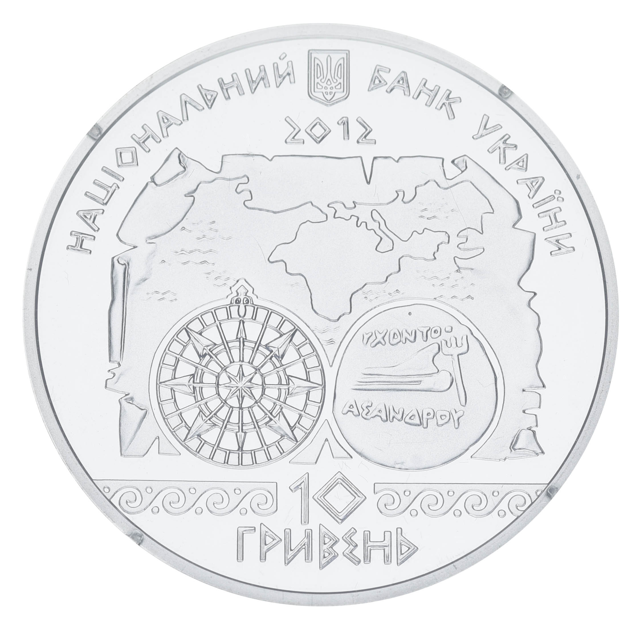 На аверсе монеты размещено: вверху малый Государственный Герб Украины, стилизованная надпись полукругом НАЦИОНАЛЬНЫЙ БАНК УКРАИНЫ, под которым год чеканки монеты - 2012, на фоне стилизованной карты изображено слева розу ветров как символ морских путешествий и справа античную монету Боспорского лента и номинал: на монете из серебра – 10/ГРИВЕН.