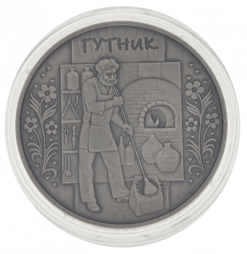Посвящена гутничеству – изготовлению стекла, известному еще со времен Киевской Руси. За многие столетия развития гутничество достигло высокого художественного уровня. Особенно оригинальными были баклаги, бочонки, разные бутыли, кварты и разная фигурная посуда в виде петухов, птиц, мишек и т.д. Монета изготовлена с использованием технологии патинирования.