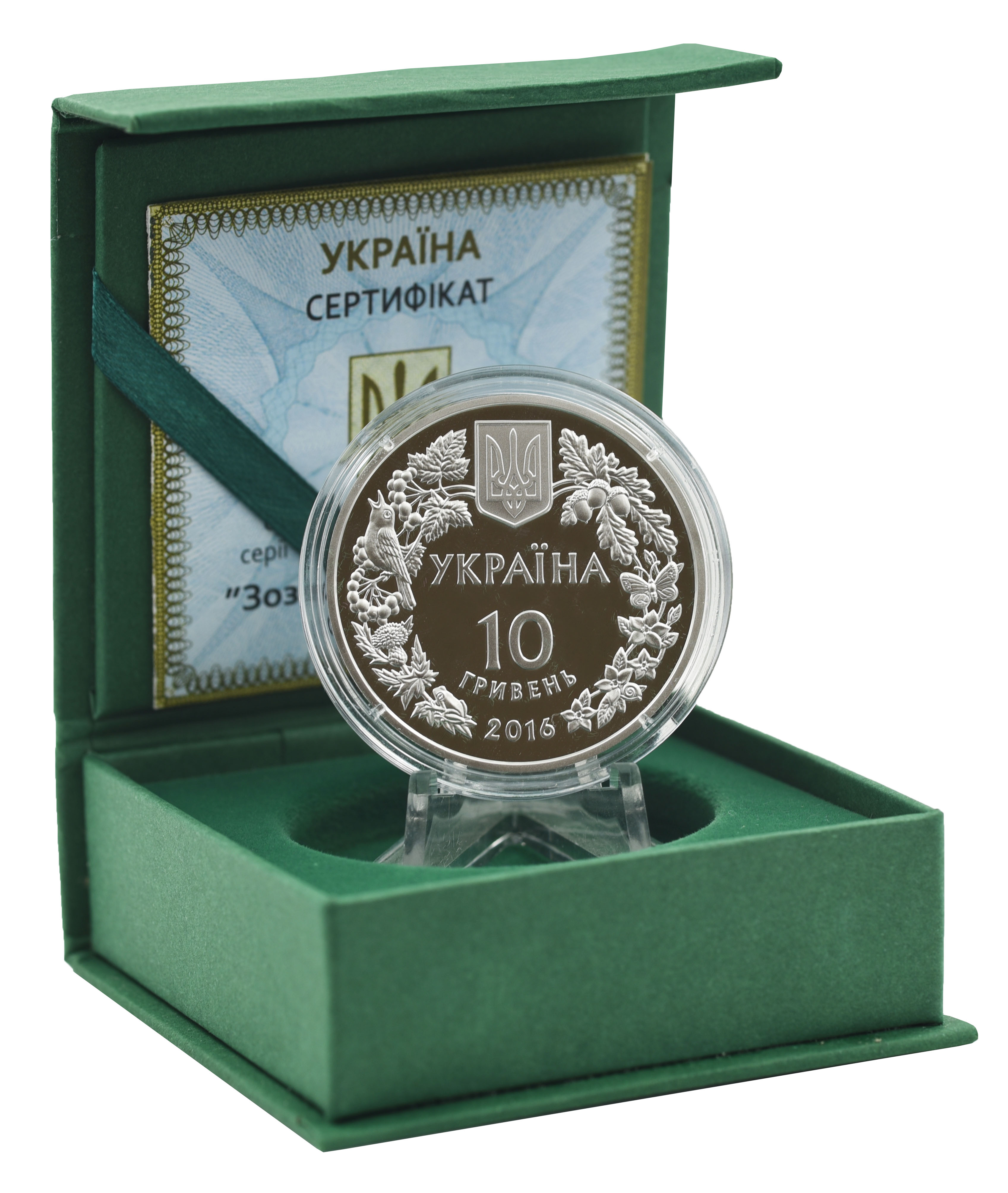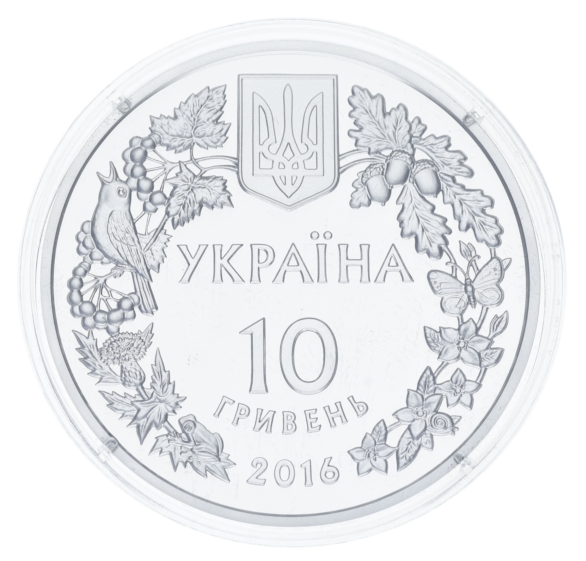 Аверс монеты обрамляет венок из двух частей, левой и правой, с изображением различных представителей флоры и фауны. В верхней части на стыке двух веток венка, большое изображение малого Государственного герба Украины. В центре аверса надпись, - «УКРАИНА» (УКРАЇНА). Под ней указан номинал монеты в две строки, - «10 ГРИВЕН» (10 ГРИВЕНЬ). В нижнем промежутке венка полукругом надпись года чеканки монеты, - «2016».