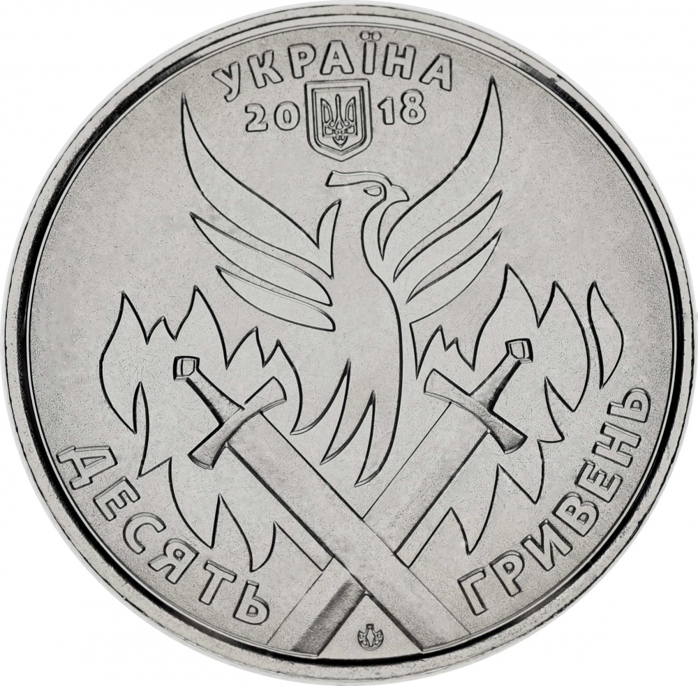 Аверс монеты оформлен с зеркальным фоном. В центре аверса аллегорическая композиция стилизованного изображения скрещенных мечей и выше них, птицы Феникса на фоне языков пламени, как символ возрождения из пепла. Вдоль верхнего наружного канта, полукругом надпись, - «УКРАИНА» (УКРАЇНА). Ниже, - изображение малого Государственного герба Украины. Слева и справа от герба указан год чеканки монеты, - «20 ⌂ 18». Внизу аверса в промежутке между скрещенными концами мечей, размещен знак логотипа Банкнотно – монетного двора Национального банка Украины. С двух сторон от знака логотипа, полукругом разделенная пополам надпись номинала монеты прописью, - «ДЕСЯТЬ ГРИВЕН» (ДЕСЯТЬ ГРИВЕНЬ).