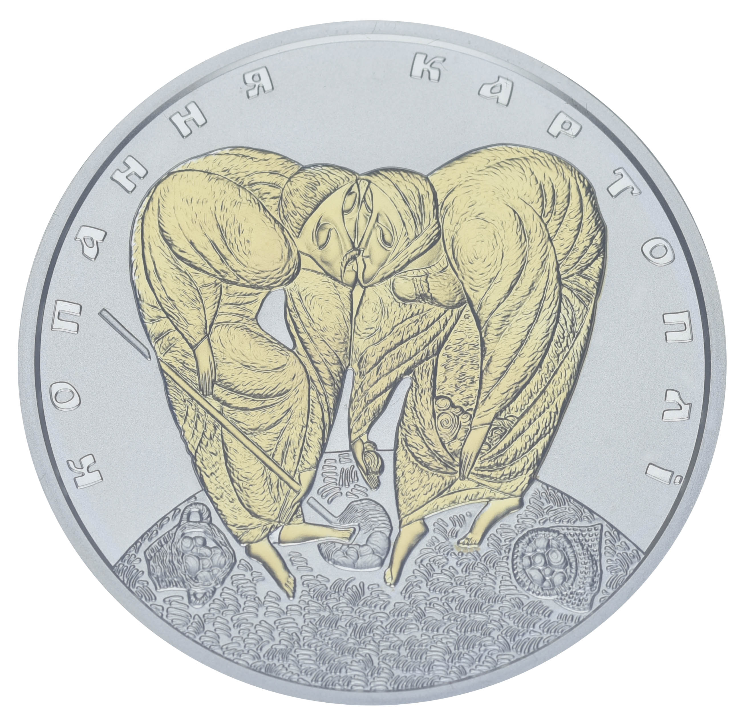Коллекционная монета из серебра, изготовлена с обеспечением специального уровня качества чеканки пруф. Посвящена копанию картошки, его раскрытию в художественно – образной манере иронического наива образов украинского архетипа. Издавна известно, стержнем исконной ценности украинского народа является земля - кормилица. Тяга и любовь к ней, возделывание земли на протяжении тысячи лет, являются объединяющим Мужчину и Женщину, изображенных в форме двух фигур в форме сердца.