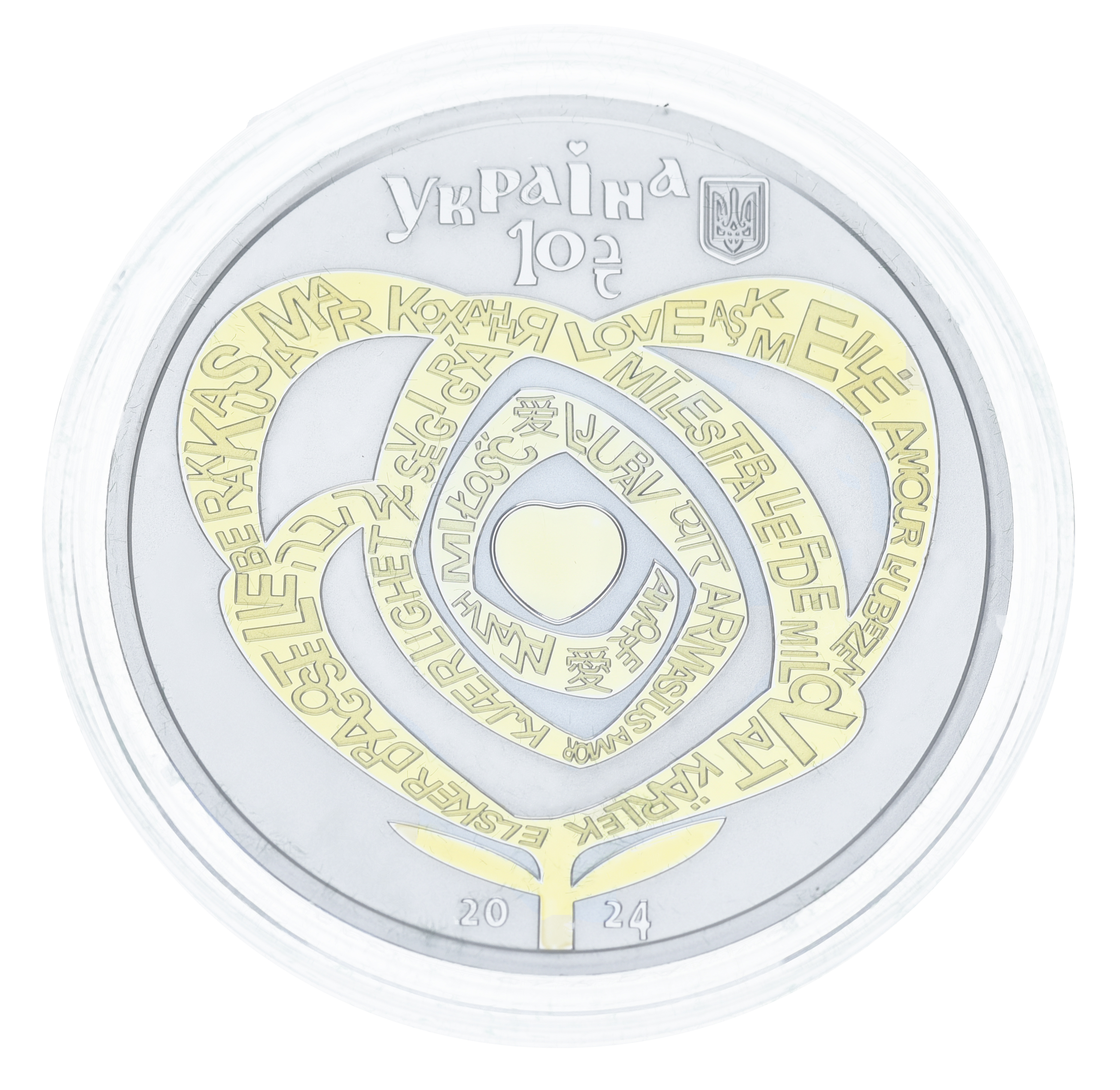 На аверсе монеты на зеркальном фоне размещены: стилизованная в виде сердца роза (элемент украшения – локальная позолота), в графическое полотно которой вписано слово «любовь» на самых распространенных языках мира, подчеркивающее универсальность и безграничность этого чувства, не знающего границ и языковых барьеров; малый Государственный Герб Украины, надпись УКРАИНА (точки над буквой "ї" изображены в форме сердца), номинал 10 и графический символ гривны (наверху над розой); надпись 20/24 (внизу).