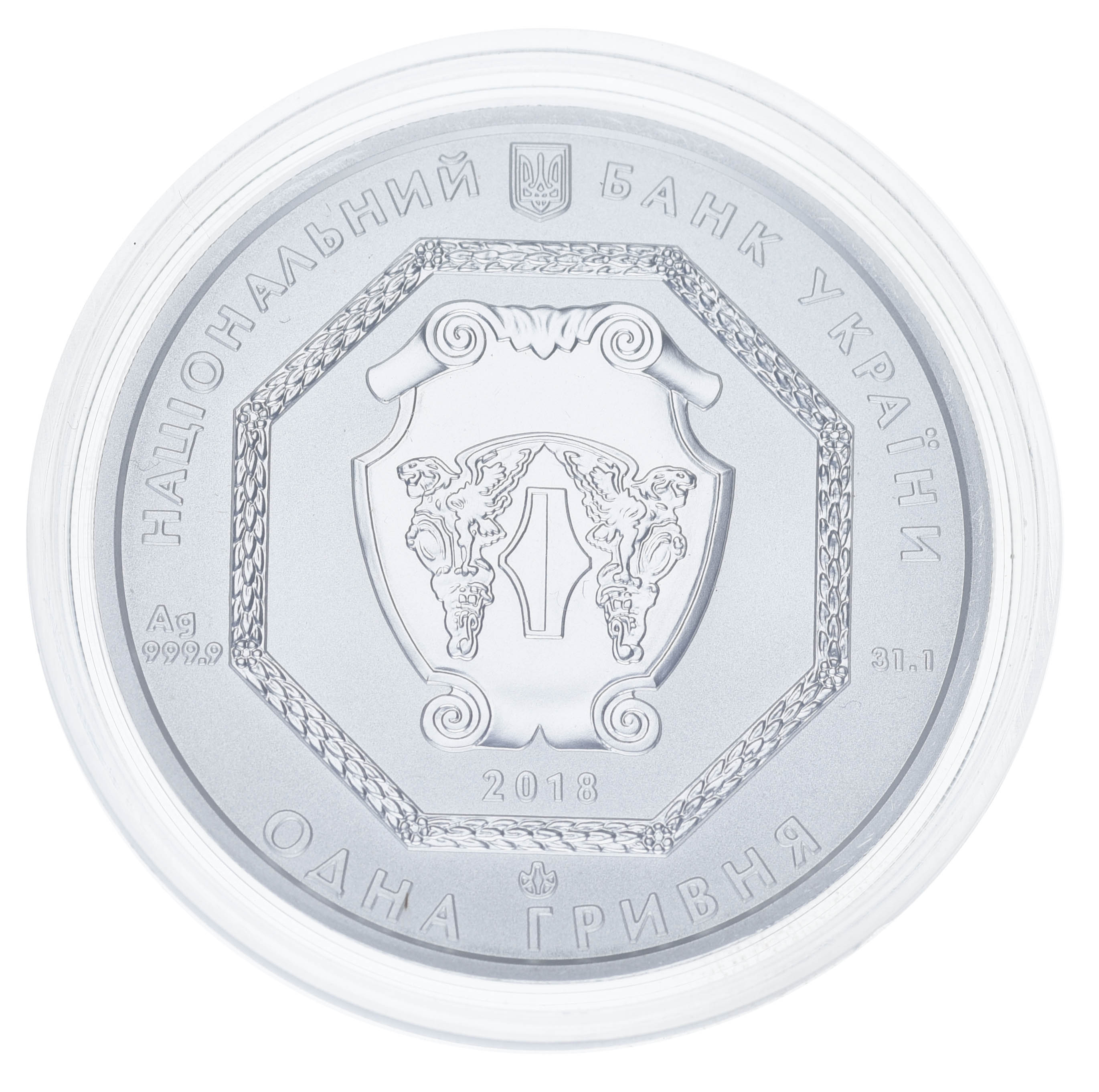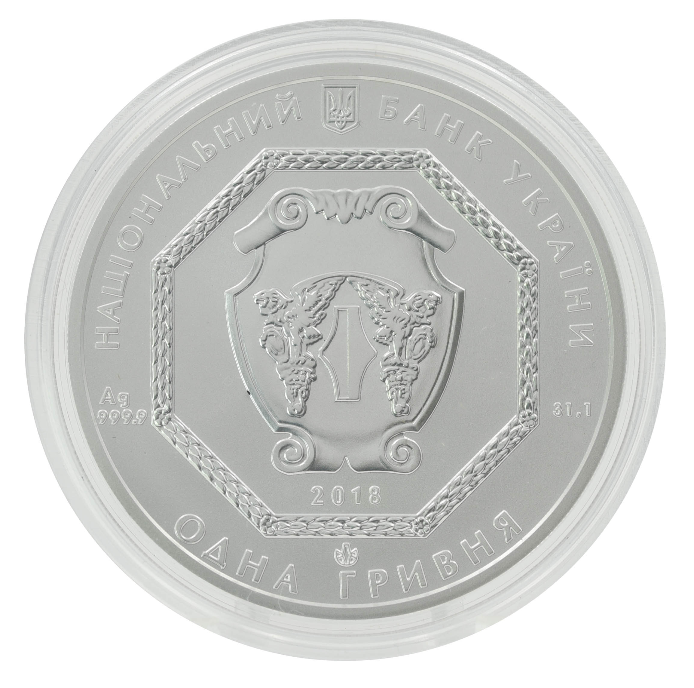 На аверсе монеты изображены: вверху — малый Государственный Герб Украины и надпись полукругом «НАЦІОНАЛЬНИЙ БАНК УКРАЇНИ». В центре, на зеркальном фоне, в изящном восьмиугольном картуше помещена эмблема Национального банка Украины: аллегорические фигуры грифонов охраняют гривну — древнюю денежно-весовую единицу. Под щитом указан год чеканки — 2018, а внизу полукругом — номинал ОДНА ГРИВНЯ.