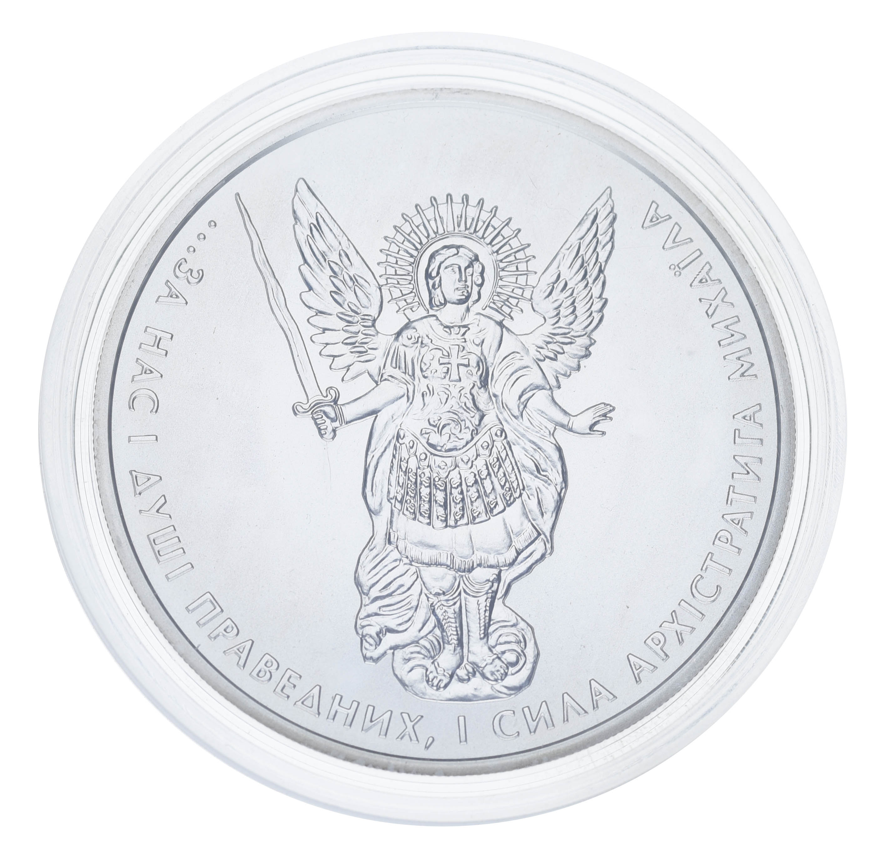 Памятная монета посвящена Архистратигу Михаилу — одному из самых почитаемых библейских персонажей, небесному воину, победителю зла и покровителю тех, кто борется за правое дело.