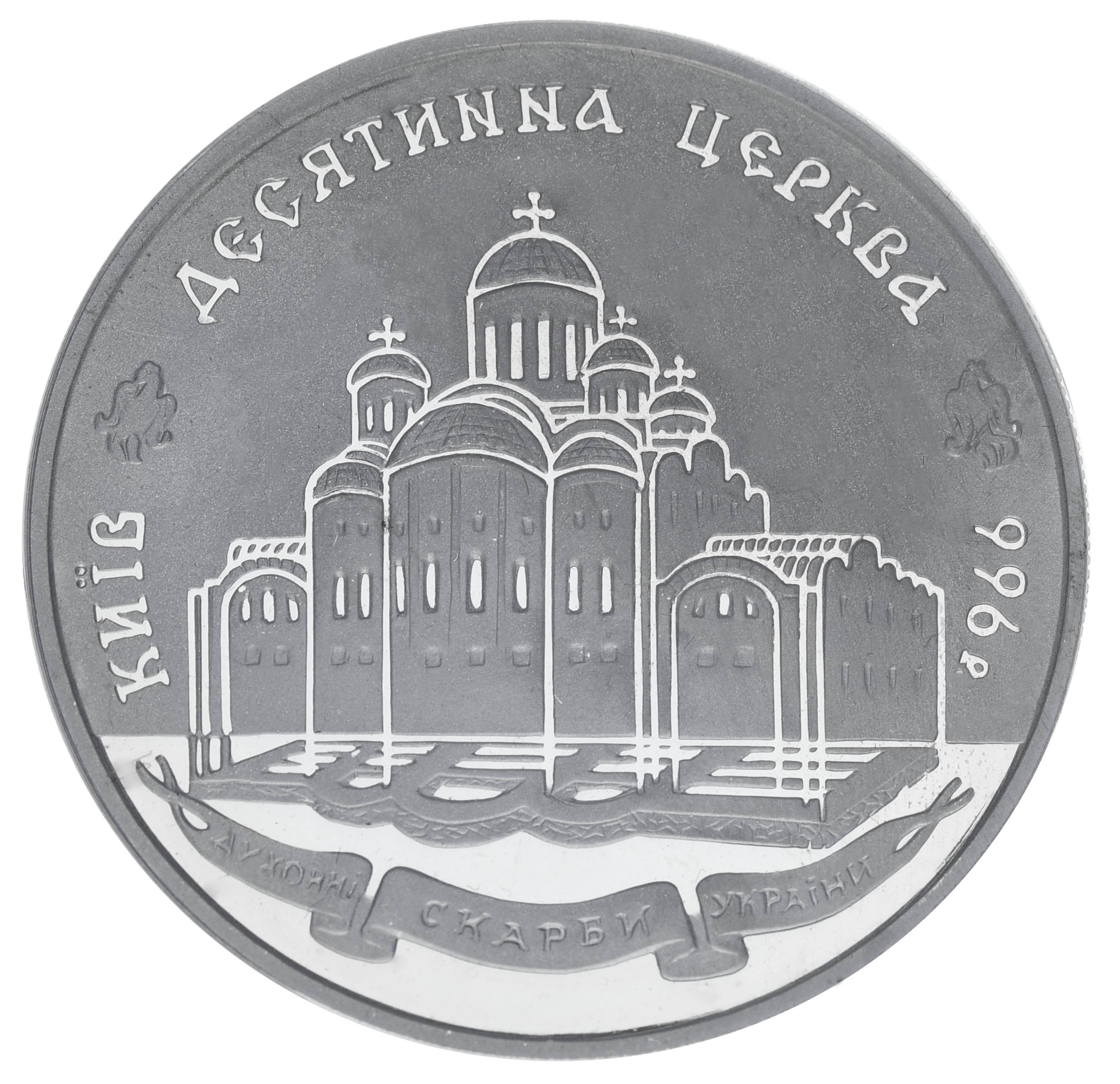 На реверсе монет в центре изображены контуры Десятинной церкви по реконструкции профессора Ю.С. Асеева. Для создания впечатления, что сооружения в действительности не существует. Эти контуры представлены зеркальными линиями на матовом фоне и вроде бы вырастают на реально существующем фундаменте снизу вверх с постепенным проявлением рельефа. На верхней матовой части монет по кругу зеркальными линиями размещены надписи КИЕВ, ДЕСЯТИНА ЦЕРКОВЬ, 996 г., отделены друг от друга стилизованными изображениями птиц. Внизу на зеркальном фоне изображена лента с надписью на ней Духовные сокровища Украины