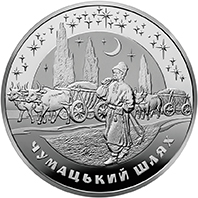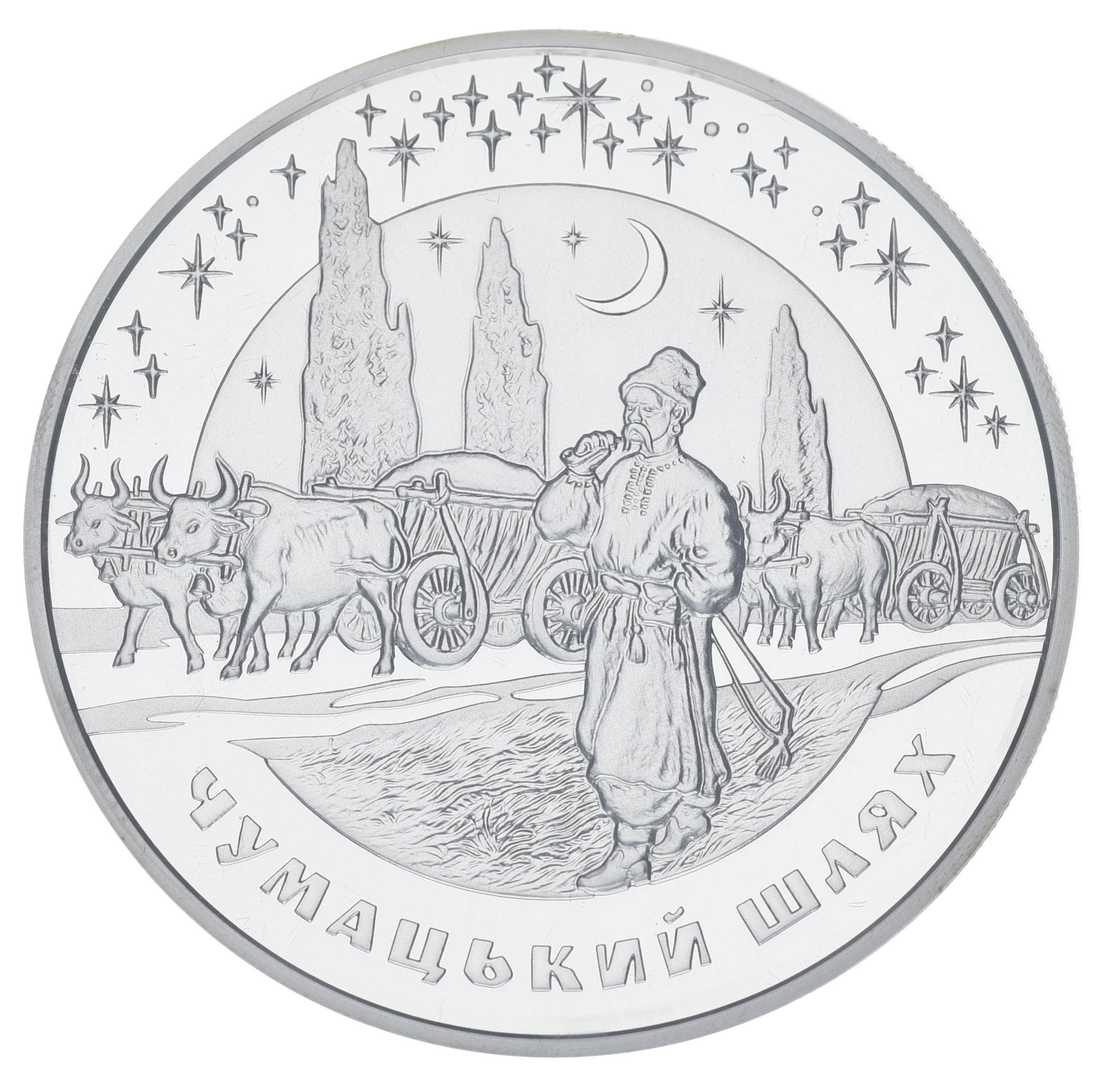 На реверсе монеты на фоне ночного пейзажа изображена жанровая сцена: чумацкие телеги, чумака с люлькой и внизу полукругом размещена надпись ЧУМАЦКИЙ ПУТЬ.