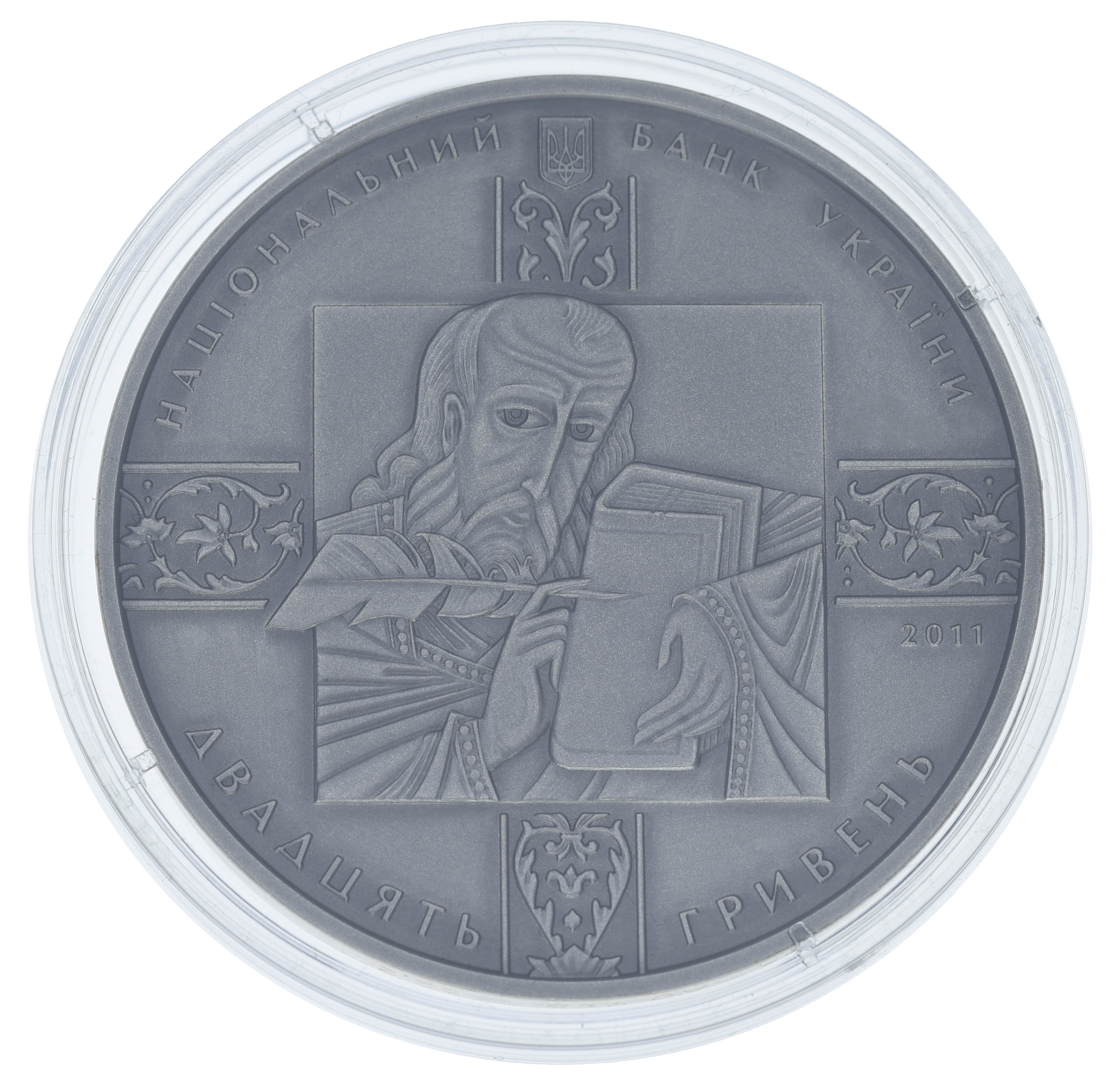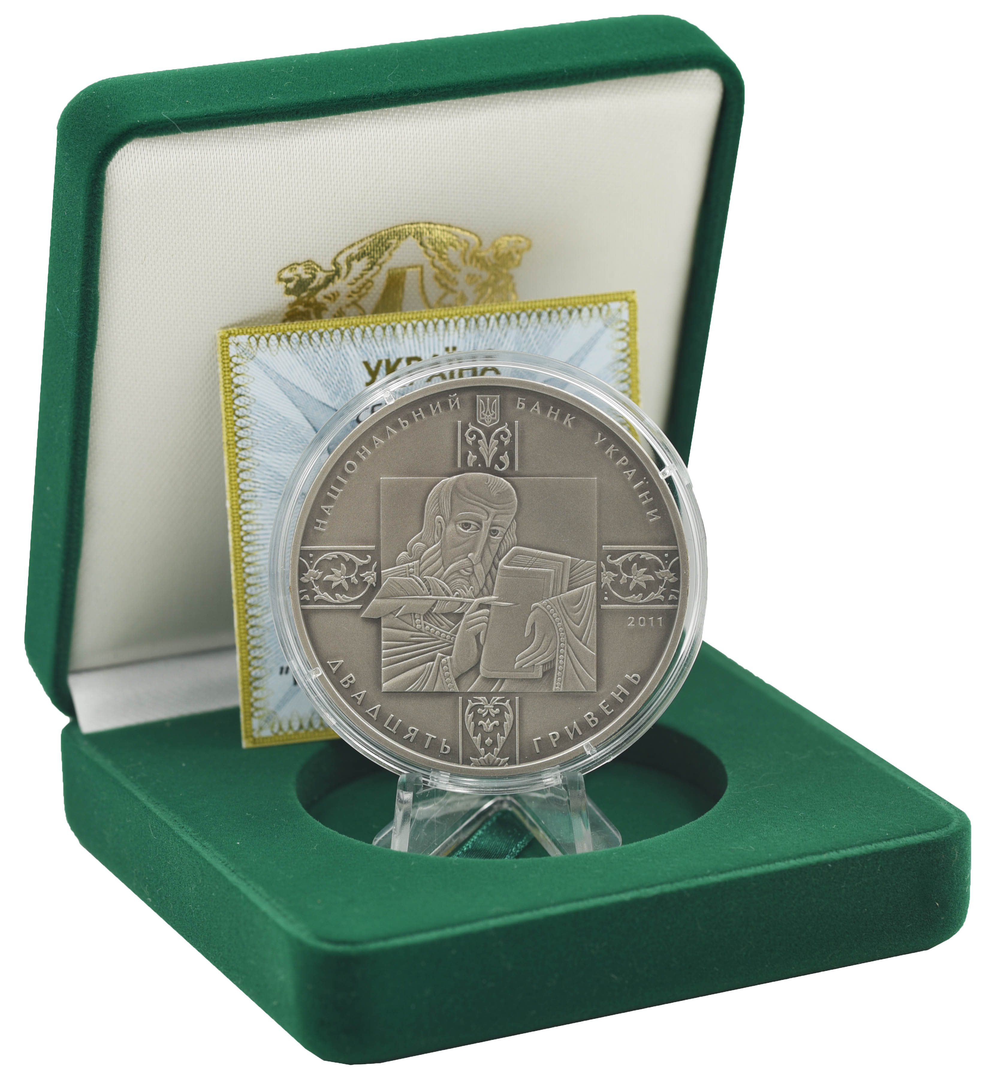 Посвящена выдающемуся историческому памятнику духовной культуры и письменности украинского народа середины XVI в. - Пересопницкое Евангелие. По содержанию Пересопницкое Евангелие - традиционное тетраевангелие, содержащее четыре канонических Евангелия, первый старинный украиноязычный памятник отечественной письменности, дошедший до нашего времени. В 1561 году в Пересопницком Пречистенском (Рождестве Богородицы) монастыре была завершена работа над ним. Переводчик текста – Григорий, архимандрит Пересопницкого монастыря, писец – Михаил Васильевич, сын протопопа Сяноцкого. Пересопницкое Евангелие – национальная реликвия, на которой президенты Украины торжественно присягают во время инаугурации на верность украинскому народу. Монета изготовлена с использованием технологии патинирования, элемент отделки - локальная позолота (содержание золота в чистоте не менее 0,001518 г).