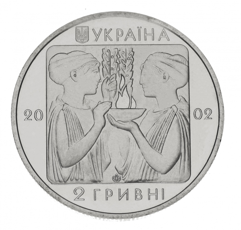 На аверсе монеты в квадрате изображена аллегорическая сцена открытия Олимпийских игр: две женские фигуры в туниках держат в руках чашу с огнем и лавровые ветви – символ мира. Выше квадрата слева изображен малый Государственный герб Украины, посредине надпись, - «УКРАИНА» (УКРАЇНА), ниже квадрата номинал монеты, - «2 ГРИВНЫ» (2 ГРИВНІ), слева и справа от квадрата разделенная надпись года выпуска монеты, - «20–02», внизу, - логотип Монетного двора Национального банка Украины.