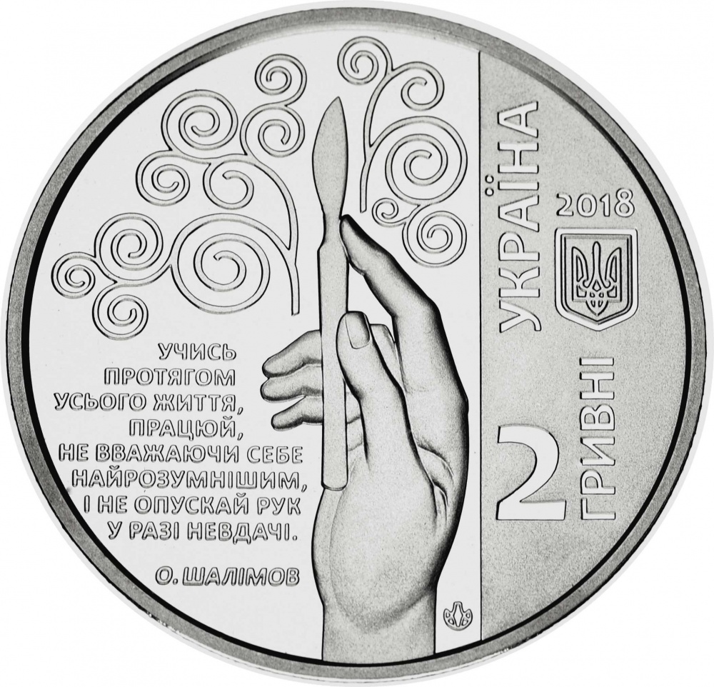 Аверс монеты по вертикали разделен на два поля, левое с зеркальным фоном, правое, - с матовым. На правой половине, в верхней части находится малый Государственный герб Украины. Выше герба указан год выпуска монеты, - «2018». Слева от герба на границе с зеркальной частью аверса, вертикальная надпись снизу вверх, - «УКРАИНА» (УКРАЇНА). Ниже надписи, указан номинал монеты, - «2 ГРИВНЫ» (2 ГРИВНІ), номинал написан справа по вертикали снизу вверх. На левом зеркальном фоне в центре, стилизованная композиция: изображение руки держащей скальпель, который находится в середине стилизованного узора символизирующего так называемое «дерево жизни». Слева от руки многострочная надписи, - «УЧИСЬ / НА ПРОТЯЖЕНИИ / ВСЕЙ ЖИЗНИ, / РАБОТАЙ, / НЕ СЧИТАЯ СЕБЯ / САМЫМ УМНЫМ, / И НЕ ОПУСКАЙ РУК / В СЛУЧАЕ НЕУДАЧИ / А. ШАЛИМОВ» (УЧИСЬ / ПРОТЯГОМ / УСЬОГО ЖИТТЯ, / ПРАЦЮЙ, / НЕ ВВАЖАЮЧИ СЕБЕ / НАЙРОЗУМНІШИМ, / І НЕ ОПУСКАЙ РУК / У РАЗІ НЕВДАЧІ / О. ШАЛІМОВ). Знак логотипу Банкнотно – монетного двора Национального банка Украины размещается на зеркальном фоне у периметра монеты внизу, справа от изображения руки.