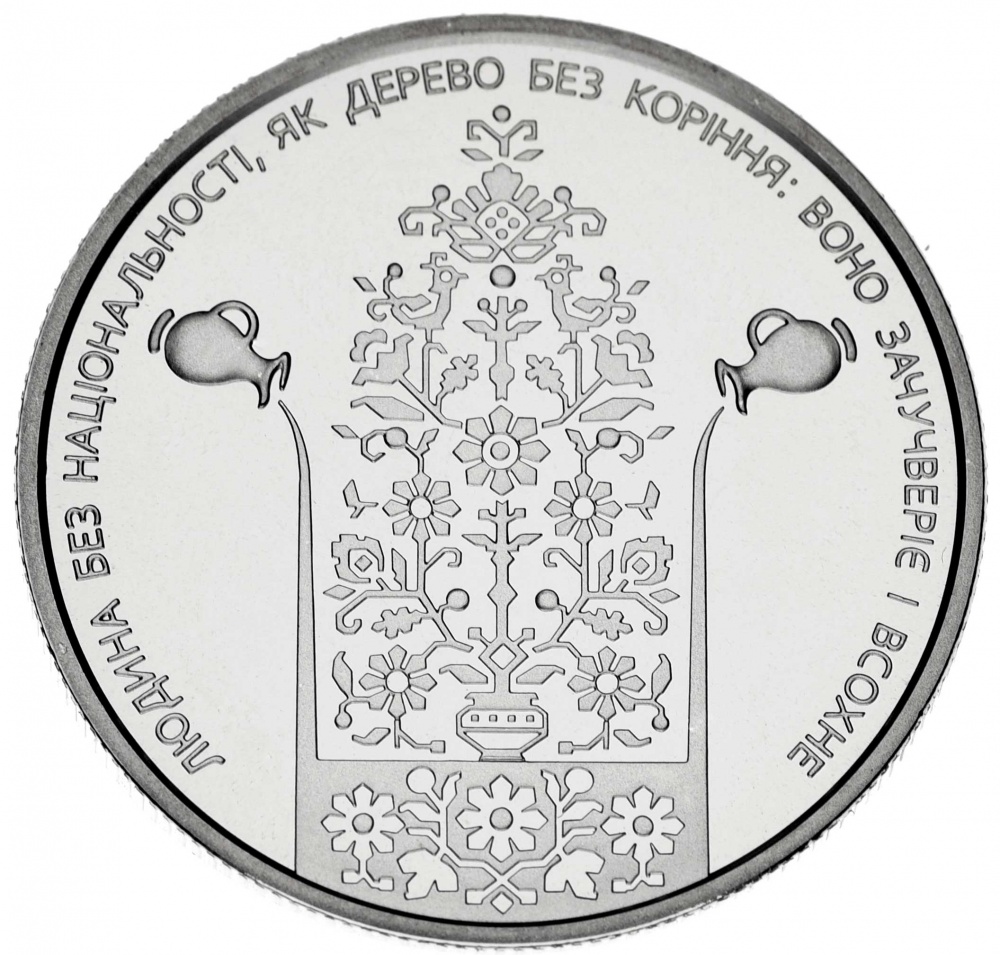 На реверсе монеты на зеркальном фоне размещена стилизованная композиция: дерево жизни, с обеих сторон от которого кувшины, из которых льется подпитывающая дерево вода; по кругу – высказывание писателя: ЧЕЛОВЕК БЕЗ НАЦИОНАЛЬНОСТИ, КАК ДЕРЕВО БЕЗ КОРНИ: ОНО ЗАЧУВЕРЕЕТ И ВСОХНЕТ.