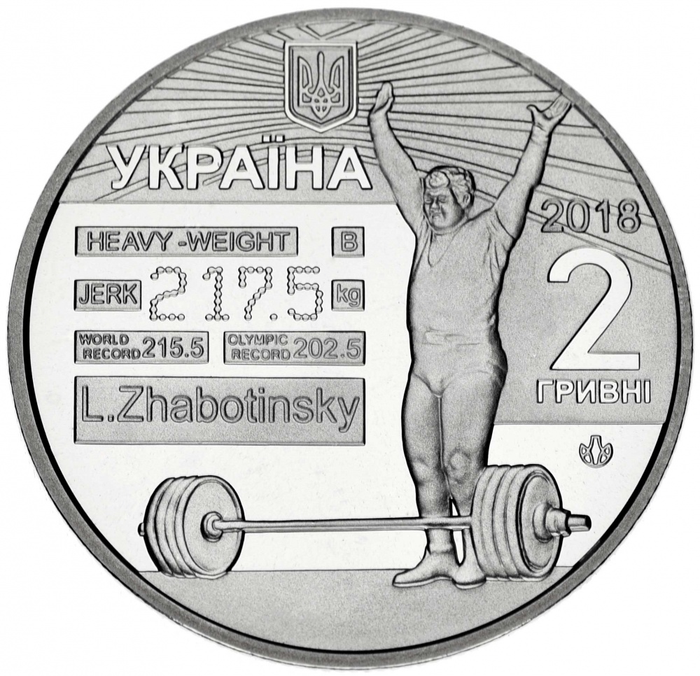 Аверс монеты заполняет комплексная композиция на которой с правой стороны изображена фигура тяжелоатлета возле штанги с победно поднятыми руками. С левой стороны от него на зеркальном фоне, - стилизованное изображение спортивного табло, на котором отражены олимпийский и мировые рекорды Леонида Жаботинского. С правой стороны от фигуры спортсмена надпись в два ряда, - номинал монеты, - «2 ГРИВНЫ» (2 ГРИВНІ). Выше номинала указан год чеканки памятной монеты, - «2018». Ниже размещен знак логотипа Банкнотно – монетного двора Национального банка Украины. Вверху аверса, стилизованное изображение лучей в виде рельефных линий исходящих из центра, где находится малый Государственный герб Украины. Ниже герба надпись, - «УКРАИНА» (УКРАЇНА).