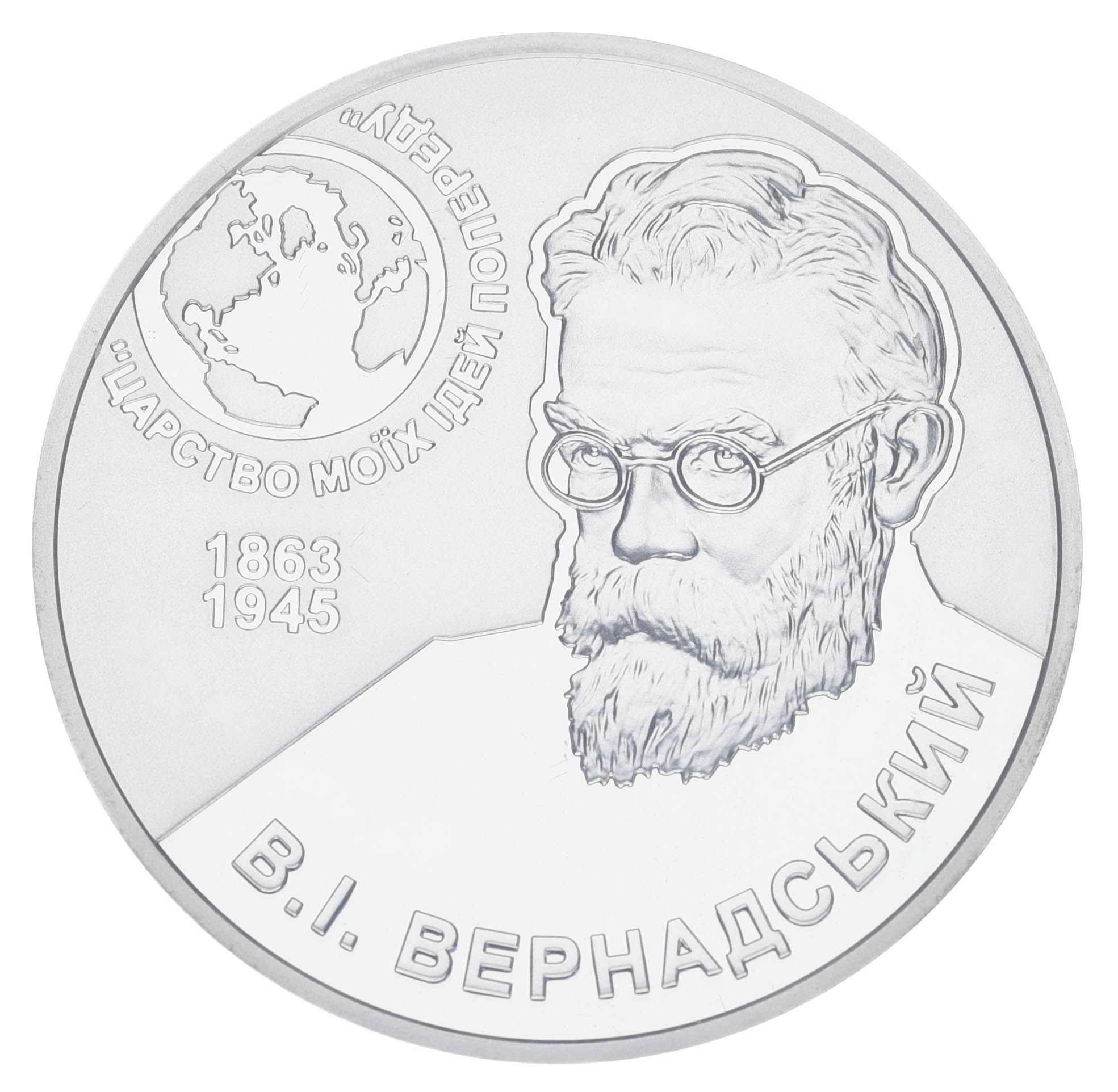 На реверсе монеты изображено: на переднем плане справа – портрет Владимира Ивановича Вернадского; слева вверху - земной шар, под которым изречение ученого `ЦАРСТВО МОИХ ИДЕЙ ВПЕРЕД` и годы жизни 1863/1945; внизу надпись В. И. ВЕРНАДСКИЙ.