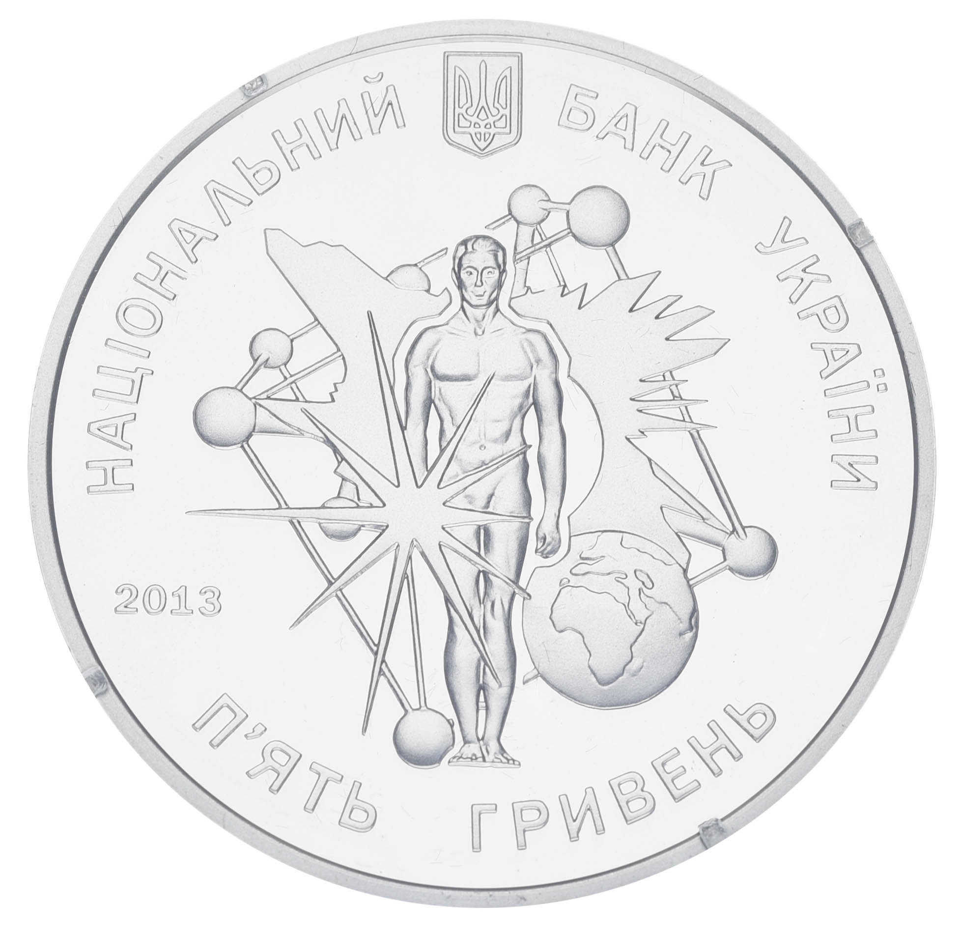На аверсе монеты размещены: вверху малый Государственный Герб Украины и надпись полукругом НАЦИОНАЛЬНЫЙ БАНК УКРАИНЫ; в центре - композицию, включающую элементы, отражающие мировосприятие ученого: земной шар, кристаллическая решетка кремния, фигура человека и вспышка света за ней, символизирующая зарождение новой жизни; внизу номинал – ПЯТЬ ГРИВЕН, слева год чеканки монеты – 2013.