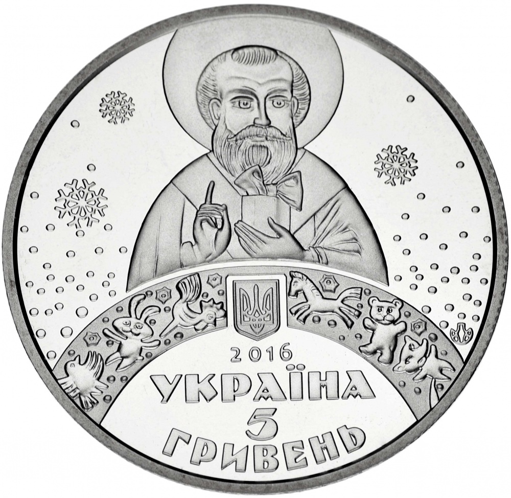 Аверс монеты оформлен в художественно – тематическом стиле. На зеркальном фоне изображение Святого Николая с нимбом над головой, за ним, стилизованное изображение падающих снежинок. Святой стоит у декоративной дуги в виде радуги с орнаментом из детских игрушек. По центру дуги изображение малого Государственного герба Украины. Ниже герба указан год чеканки монеты, - «2016», под ним горизонтальная надпись, - «УКРАИНА» (УКРАЇНА). Ниже надписи полукругом двухстрочная надпись номинала монеты, - «5 ГРИВЕН» (5 ГРИВЕНЬ). С правой стороны радуги возле внешнего канта размещен знак логотипа Банкнотно – монетного двора Национального банка Украины.