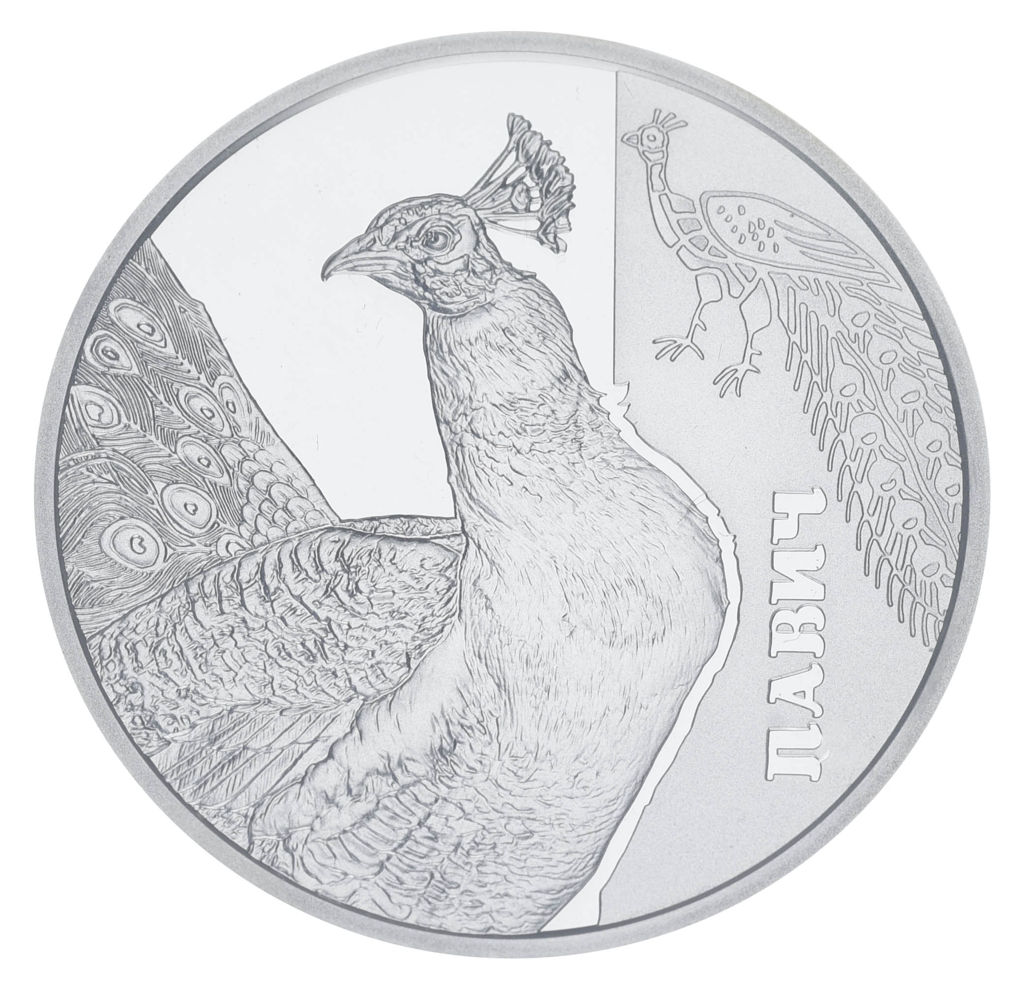 Реверс монеты разделен по вертикали на два поля. Левое с зеркальным фоном, правое, с матовым фоном. На зеркальном фоне большое изображение павлина. На правом, матовом фоне, в верхней части реверса, изображение павлина, - фрагмента миниатюры с Юрьевского Евангелие XII столетия. Ниже миниатюры. вертикальная надпись прописью, - «ПАВЛИН» (ПАВИЧ).