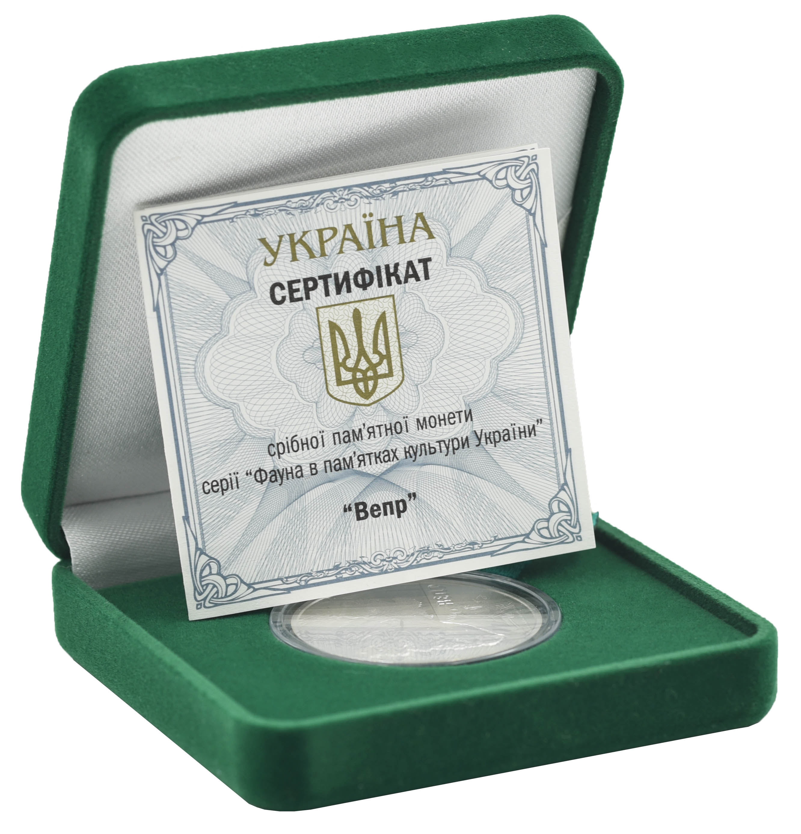 Памятная коллекционная монета из серебра, изготовлена с обеспечением специального уровня качества чеканки анциркулейтед. Посвящена историческому изображению ВЕПРЯ, которое воплощено на уникальных памятниках древних культур, существовавших на территории Украины. Эти культуры сделали весомый вклад в мировую художественную сокровищницу. Бесценные памятники культуры древних эпох рассказывают о том, как люди учились работать с природными материалами и пытались наделить их силой с помощью символов – изображений зверей, птиц, людей.