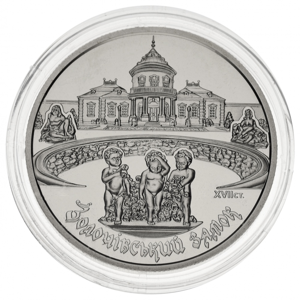 На реверсе монеты изображен внутренний двор замка – на переднем плане фонтан и скульптурная композиция трех купидонов, на втором плане – Китайский дворец, слева от которого – статуя Нептуна, справа – статуя Афродиты; размещены надписи: ЗОЛОЧЕВСКИЙ ЗАМОК (внизу полукругом), XVIІ ст. (справа).