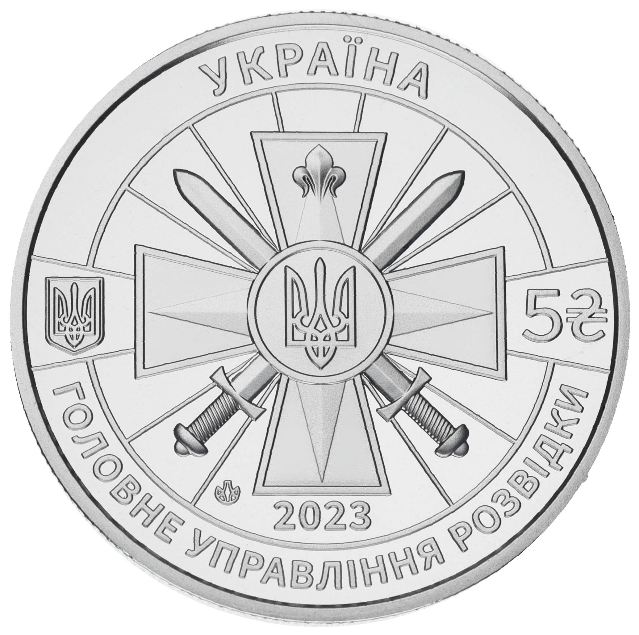 На аверсе монеты размещены: в центре на матовом фоне – эмблема Главного управления разведки Министерства обороны Украины, слева от нее – малый Государственный Герб Украины; справа – номинал 5 и графический символ гривны; надписи: УКРАИНА (полукругом вверху), 2023/ГЛАВНОЕ УПРАВЛЕНИЕ РАЗВЕДКИ (внизу); логотип Банкнотно-монетного двора Национального банка (слева от эмблемы).
