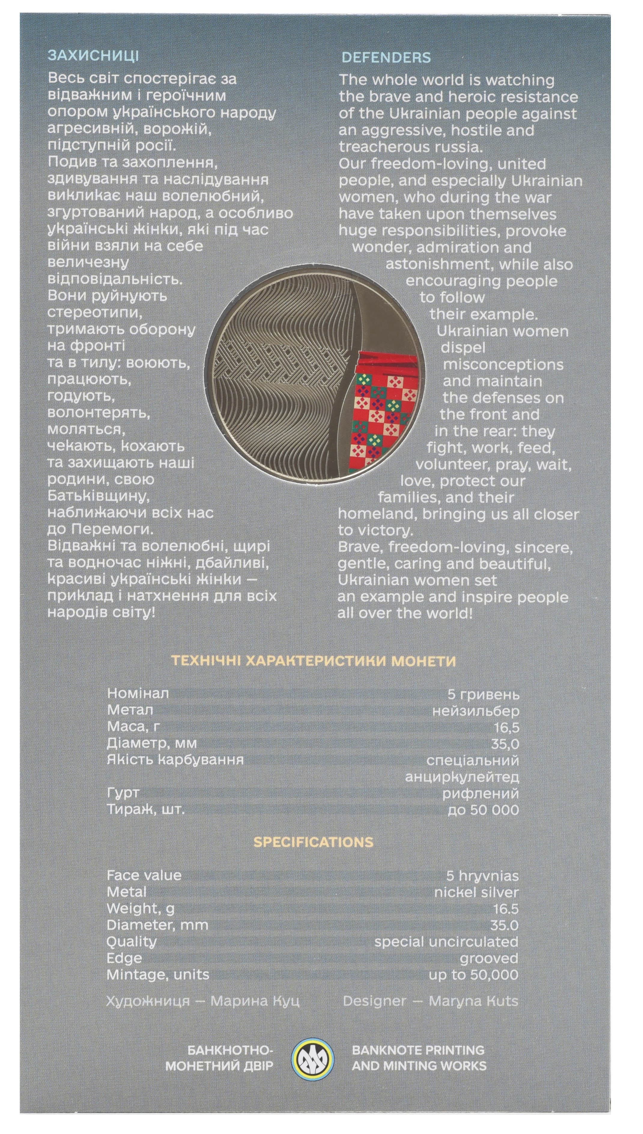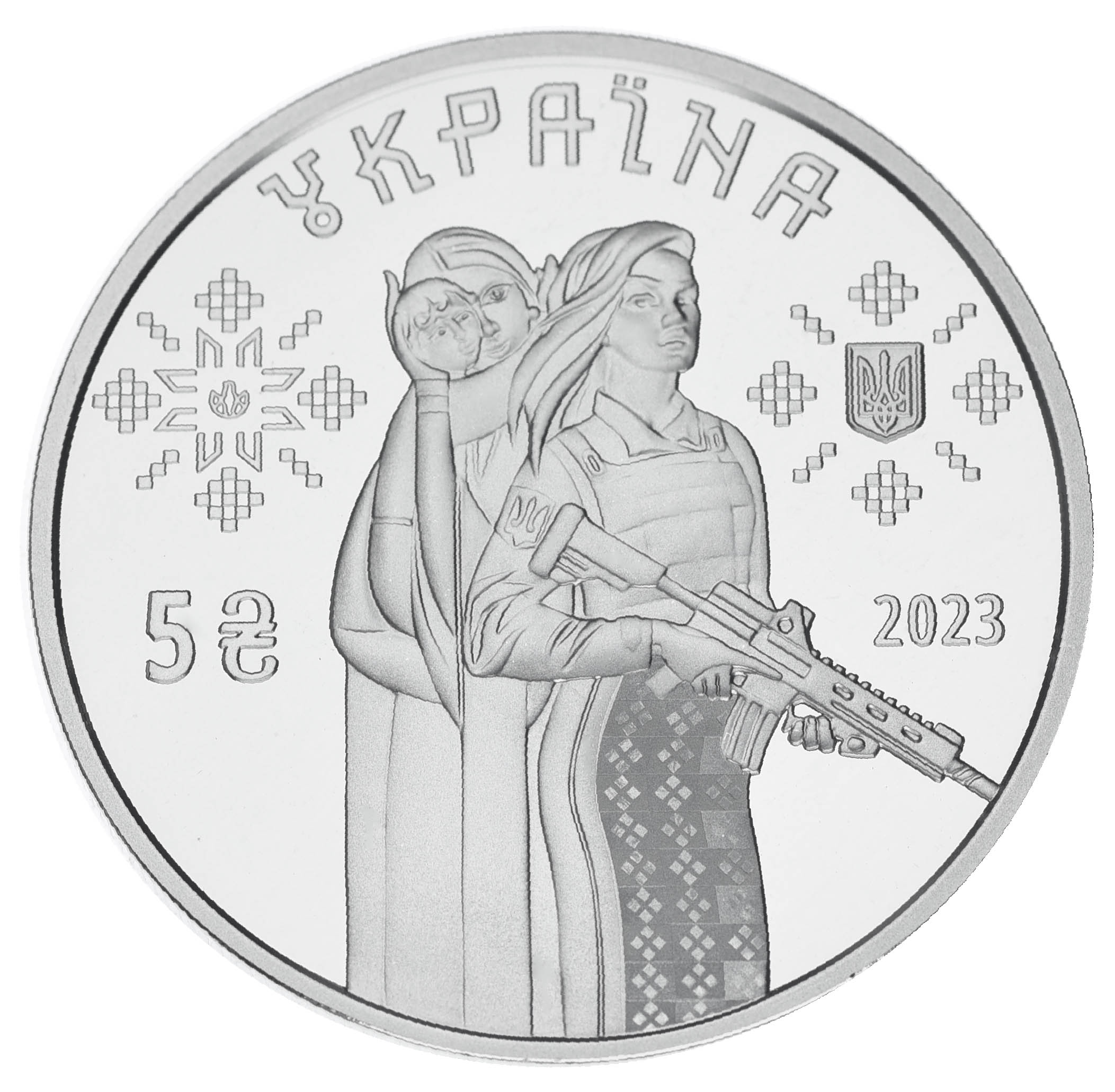 На аверсе монеты на зеркальном фоне размещены символическая композиция, демонстрирующая отважность и свободолюбие, искренность и одновременно нежность, заботливость украинских женщин, воплощенных в образах матери и защитницы, которые во время войны взяли на себя огромную ответственность – быть на защите Родины и одновременно оставаться женой, хозяйкой и матерью (в центре); вверху надпись УКРАИНА (полукругом), слева от которой изображен логотип Банкнотно-монетного двора Национального банка Украины, украшенный стилизованными орнаментами украинской вышивки, номинал – 5 и графический символ гривны; справа – малый Государственный Герб Украины, украшенный стилизованными орнаментами украинской вышивки, и год чеканки монеты 2023 года.