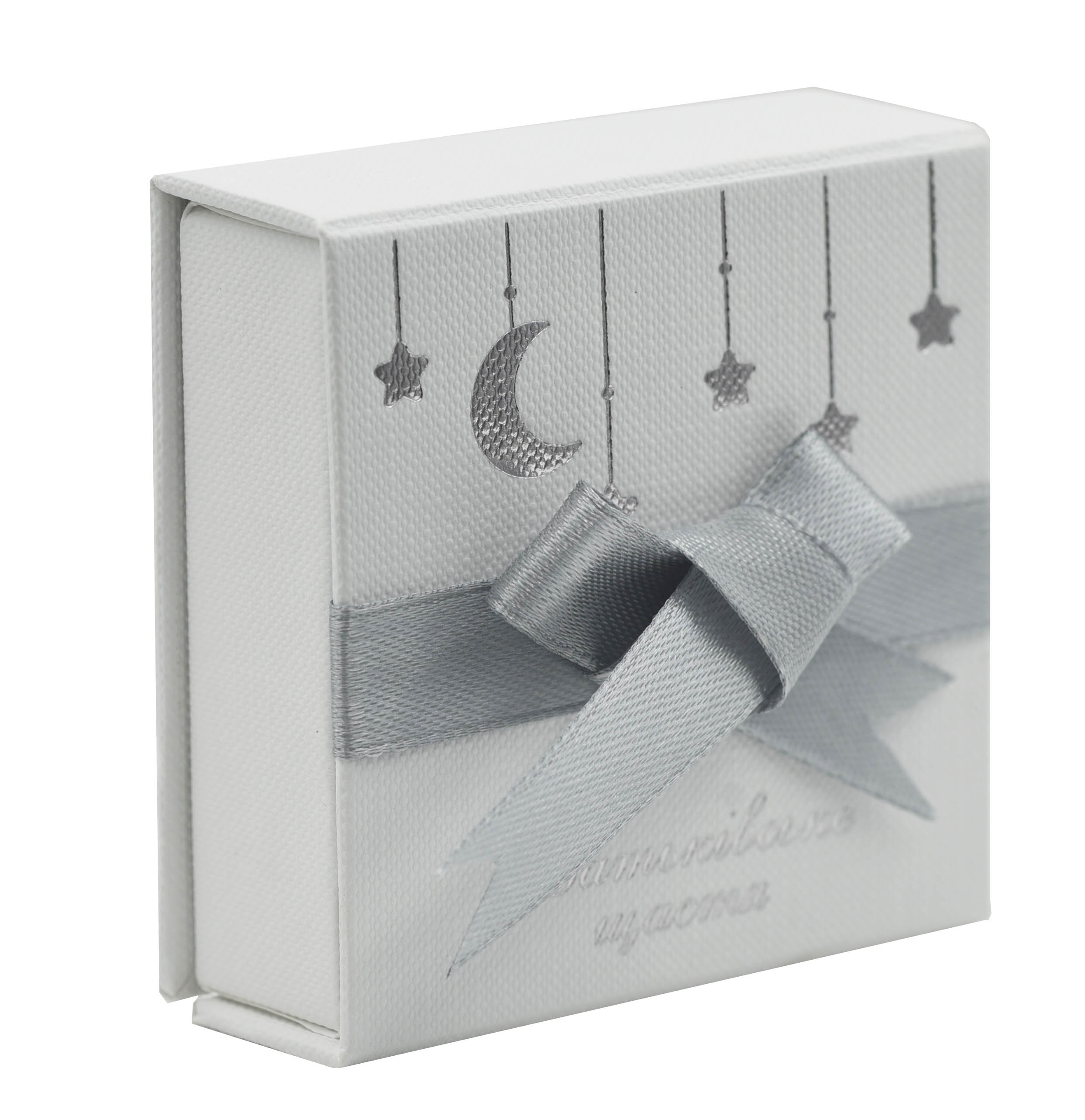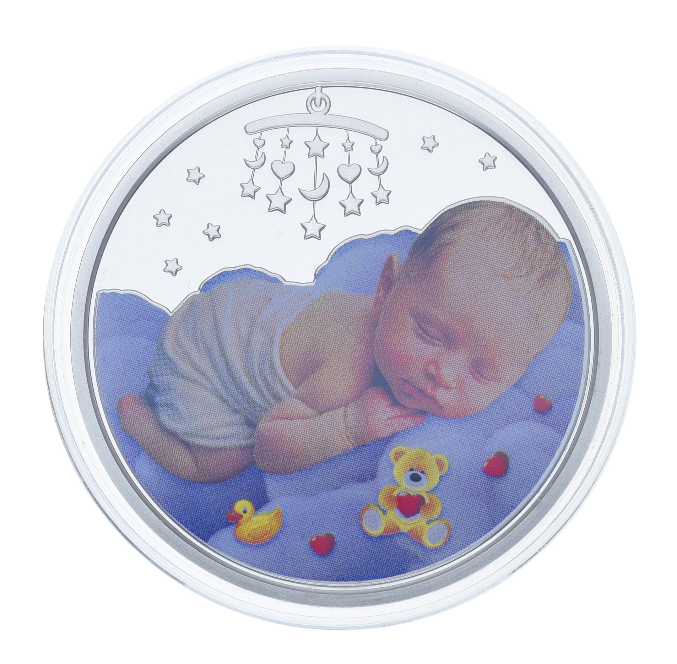 На реверсе монеты на зеркальном фоне изображен мирно спит на мягких облачках среди игрушек (элемент отделки – тампопечать). Погремушка, сияющая на фоне ночного неба, словно луна, дарит чувство покоя и уюта. Оно освещает путь ребенка в мир мечтаний и фантазий, даря беззаботные сны.