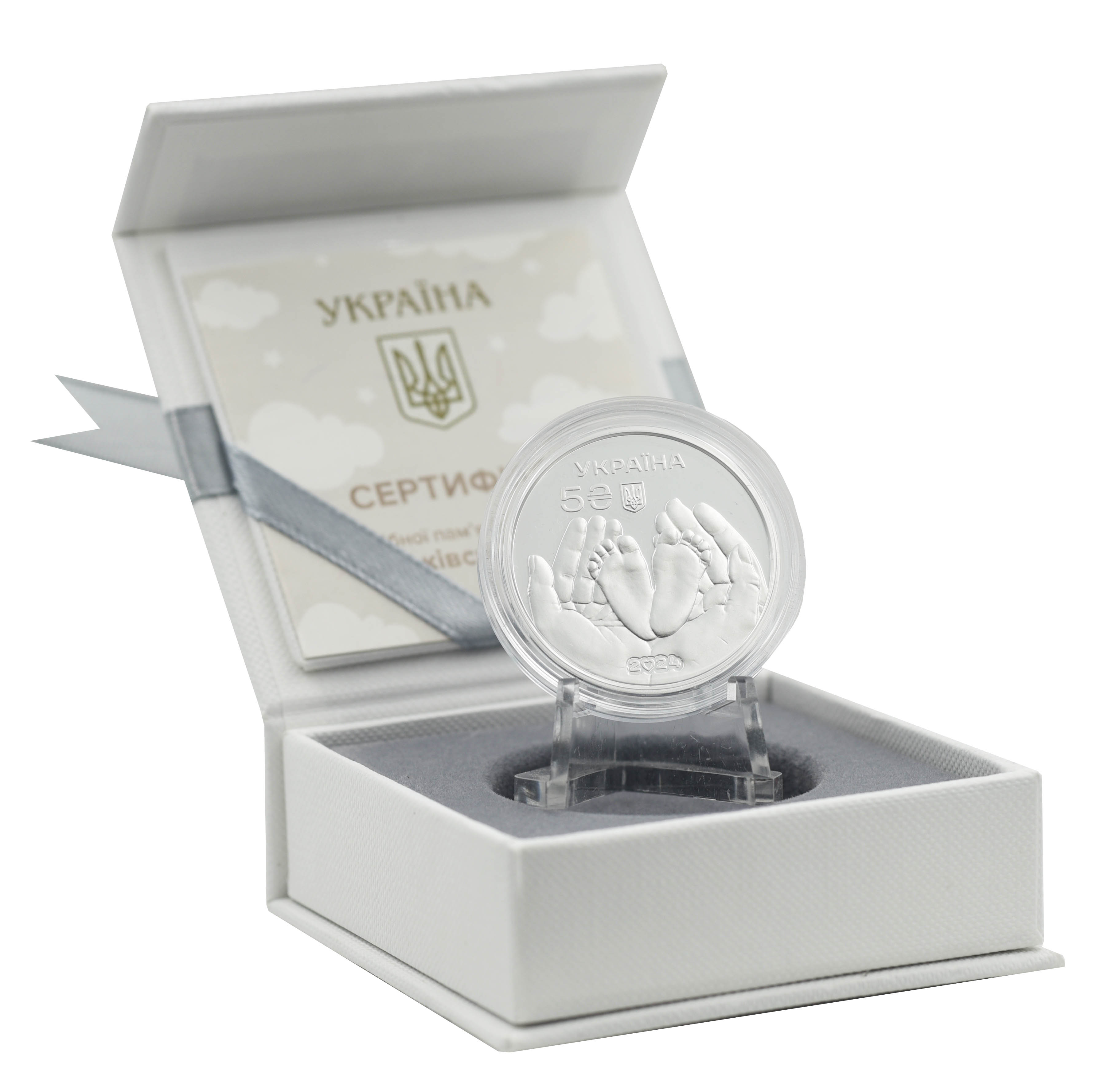 На аверсе монеты на зеркальном фоне размещена композиция: родительские руки, ласково держащие ножки младенца, символизирующие доверие, чувство защиты и любовь, соединяющую семью (по центру); надпись УКРАИНА (вверху по центру), под которой малый Государственный Герб Украины, номинал 5 и графический символ гривны (слева от рук) и внизу по центру – год чеканки монеты 2024 (ноль изображен в форме сердца).