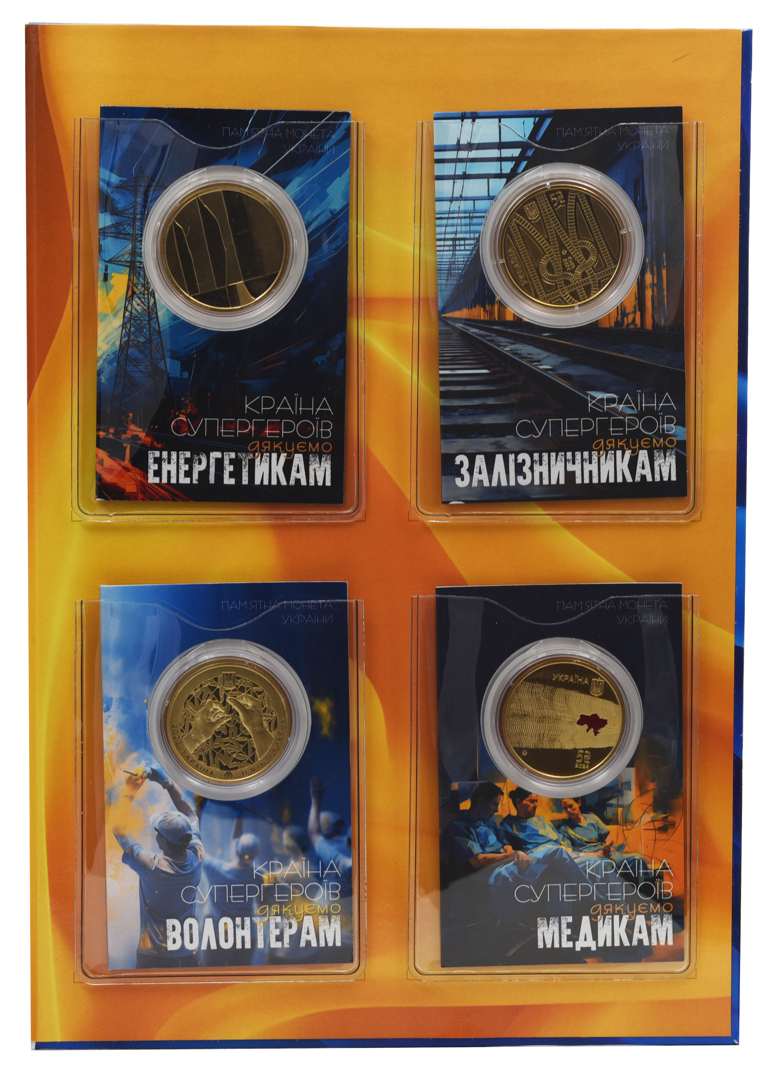Украина набор из 4 монет по 5 гривен 2023-2024 UNC Страна супергероев в альбоме Позолота