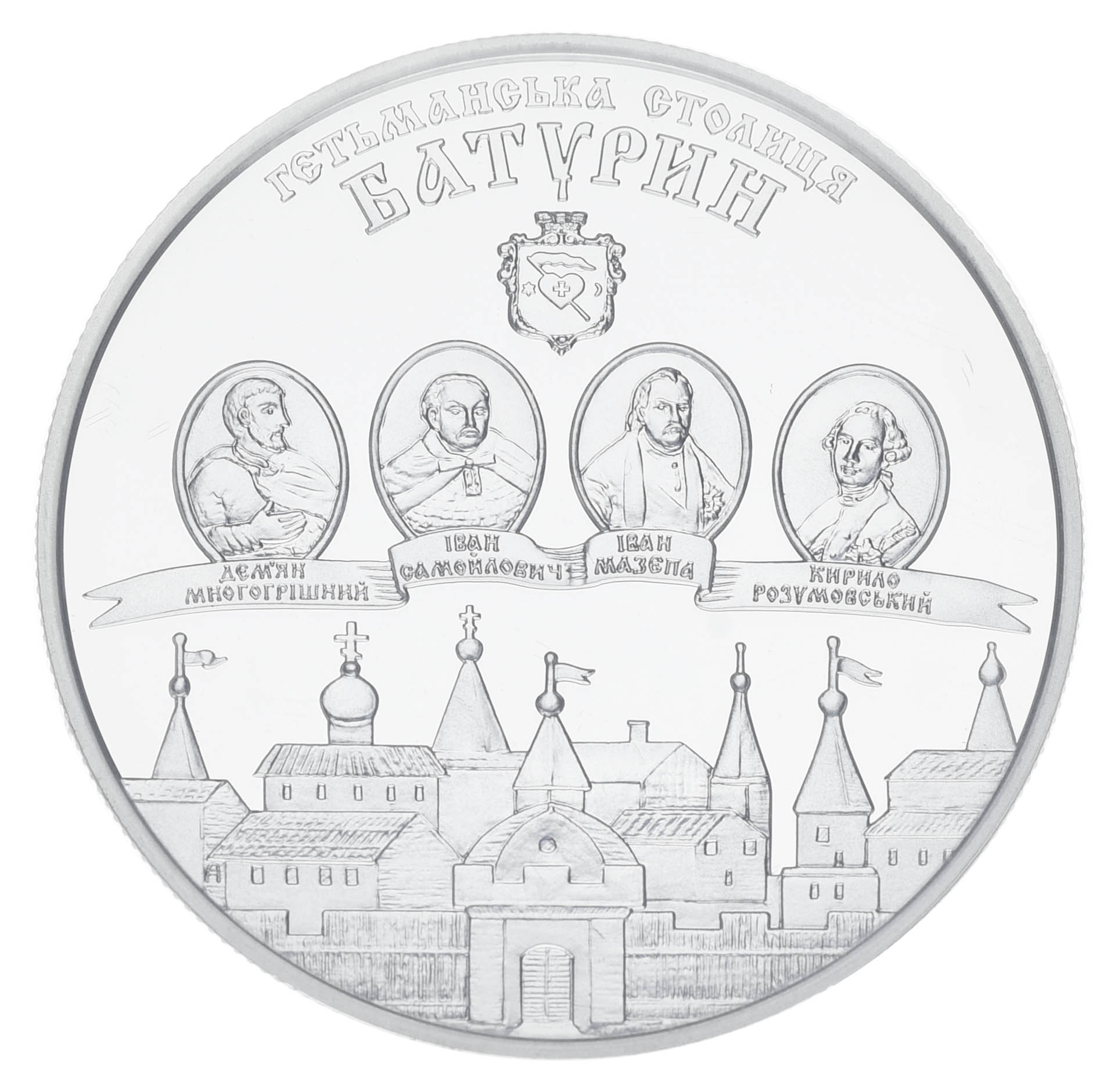На реверсі монети зображено чотири портрети в медальонах, під якими на стрічці написи у два рядки ДЕМ`ЯН МНОГОГРІШНИЙ/ ІВАН САМОЙЛОВИЧ/ ІВАН МАЗЕПА/ КИРИЛО РОЗУМОВСЬКИЙ, над портретами - герб міста, під стрічкою - вид Батурина з лубочної картини середини XIX ст., угорі півколом у два рядки розміщено написи ГЕТЬМАНСЬКА СТОЛИЦЯ/ БАТУРИН.
