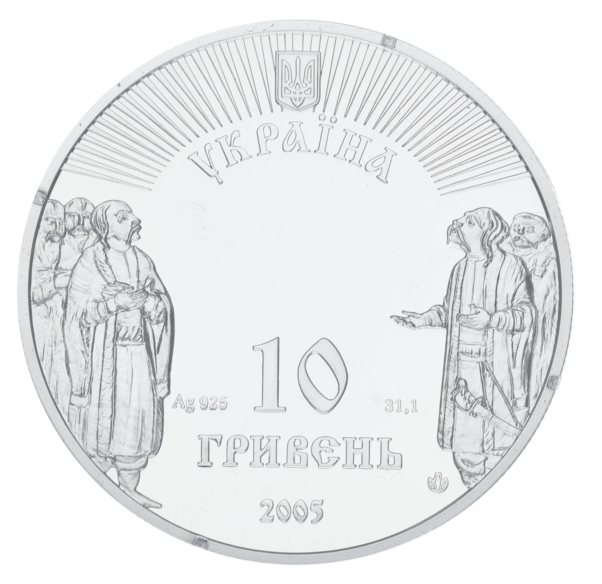 На аверсі монети зображено угорі малий Державний Герб України на тлі променів, які символізують мрію про незалежну Україну, нижче півколом розміщено напис УКРАЇНА, по обидва боки монети - запорожців з ікони Покрови Січової, унизу написи в три рядки 10/ ГРИВЕНЬ/ 2005, а також позначення металу, його проби - Ag 925, маси в чистоті - 31,1 та логотип Монетного двору Національного банку України.