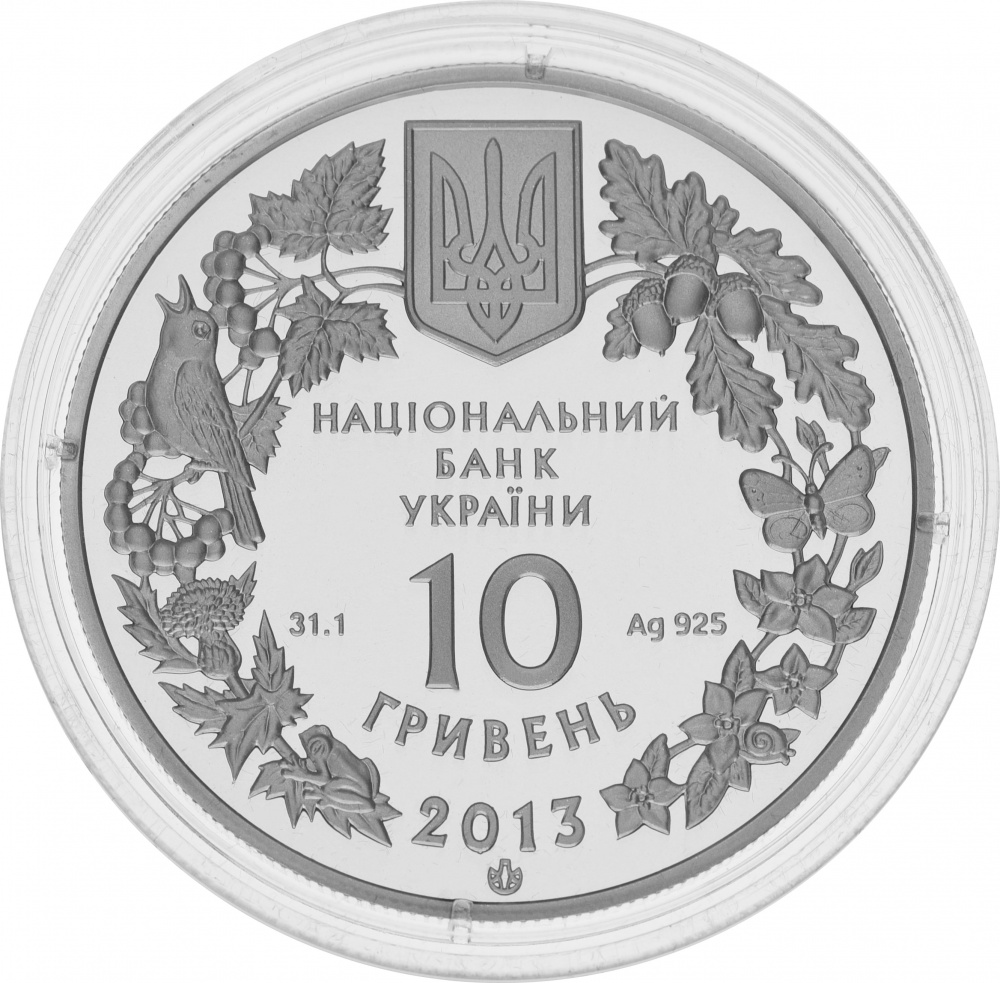 На аверсі монети в обрамленні вінка, утвореного із зображень окремих видів флори і фауни, розміщено малий Державний Герб України та написи: на монеті зі срібла - НАЦІОНАЛЬНИЙ/ БАНК/ УКРАЇНИ/ 10/ ГРИВЕНЬ/ 2013, а також позначення металу та його проби - Ag 925, маса в чистоті - 31,1, та логотип Монетного двору Національного банку України.
