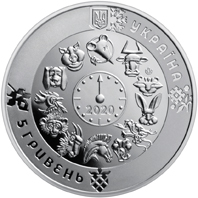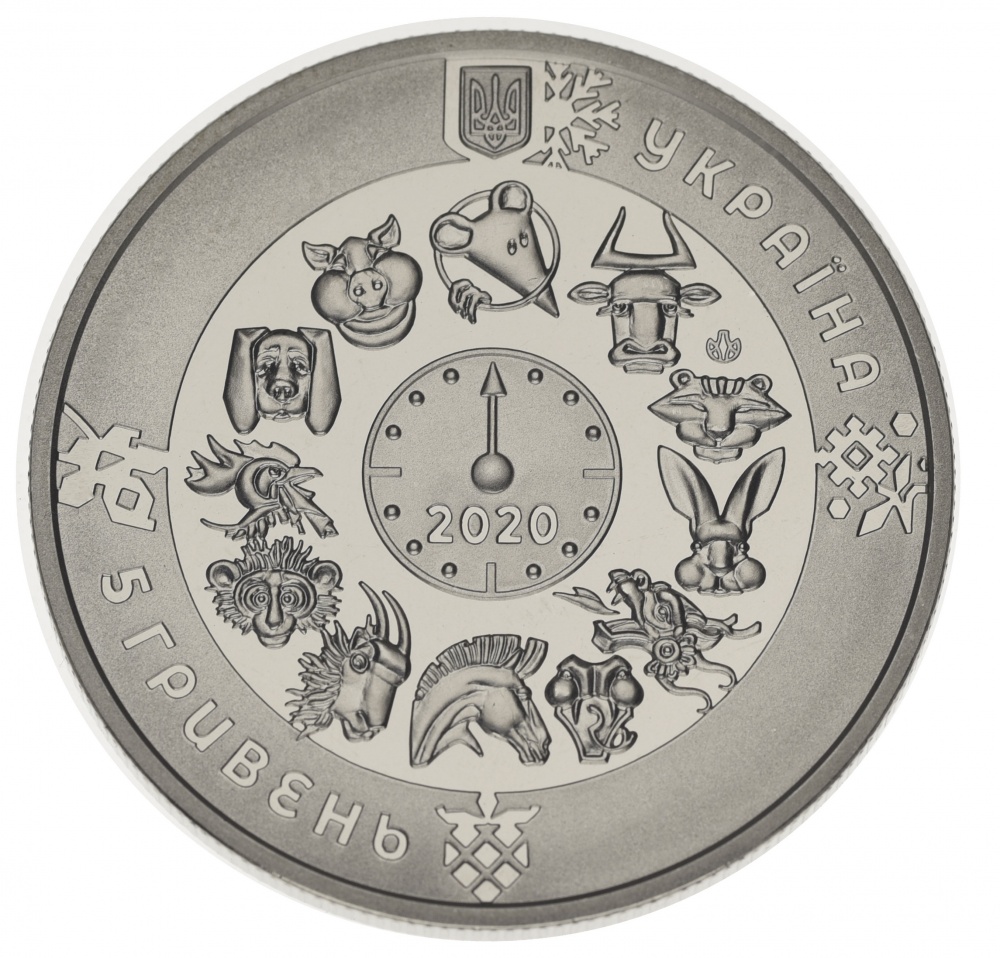 На аверсі монети розміщено: угорі – малий Державний Герб України, праворуч від якого напис півколом УКРАЇНА; на дзеркальному тлі по колу зображені 12 символів східного календаря, у центрі кола – стилізований годинник зі стрілкою, що вказує на пацюка – символ року, під стрілкою рік карбування монети – 2020; унизу ліворуч напис півколом 5 ГРИВЕНЬ; на матовому тлі зображені стилізовані під українську витинанку символи кожної пори року: сніжинка (угорі), квітка (праворуч), ягода (унизу), листок (ліворуч); логотип Банкнотно-монетного двору Національного банку України (праворуч над символом тигра).