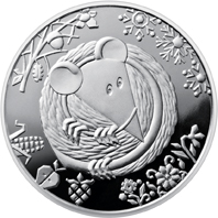 На реверсі монети зображено символ східного календаря 2020 року – згорнутого у клубочок пацюка, якого оточують по колу стилізовані символи: сніжинки (угорі праворуч), квітки (унизу праворуч), плоди (унизу ліворуч), гілки (угорі ліворуч).