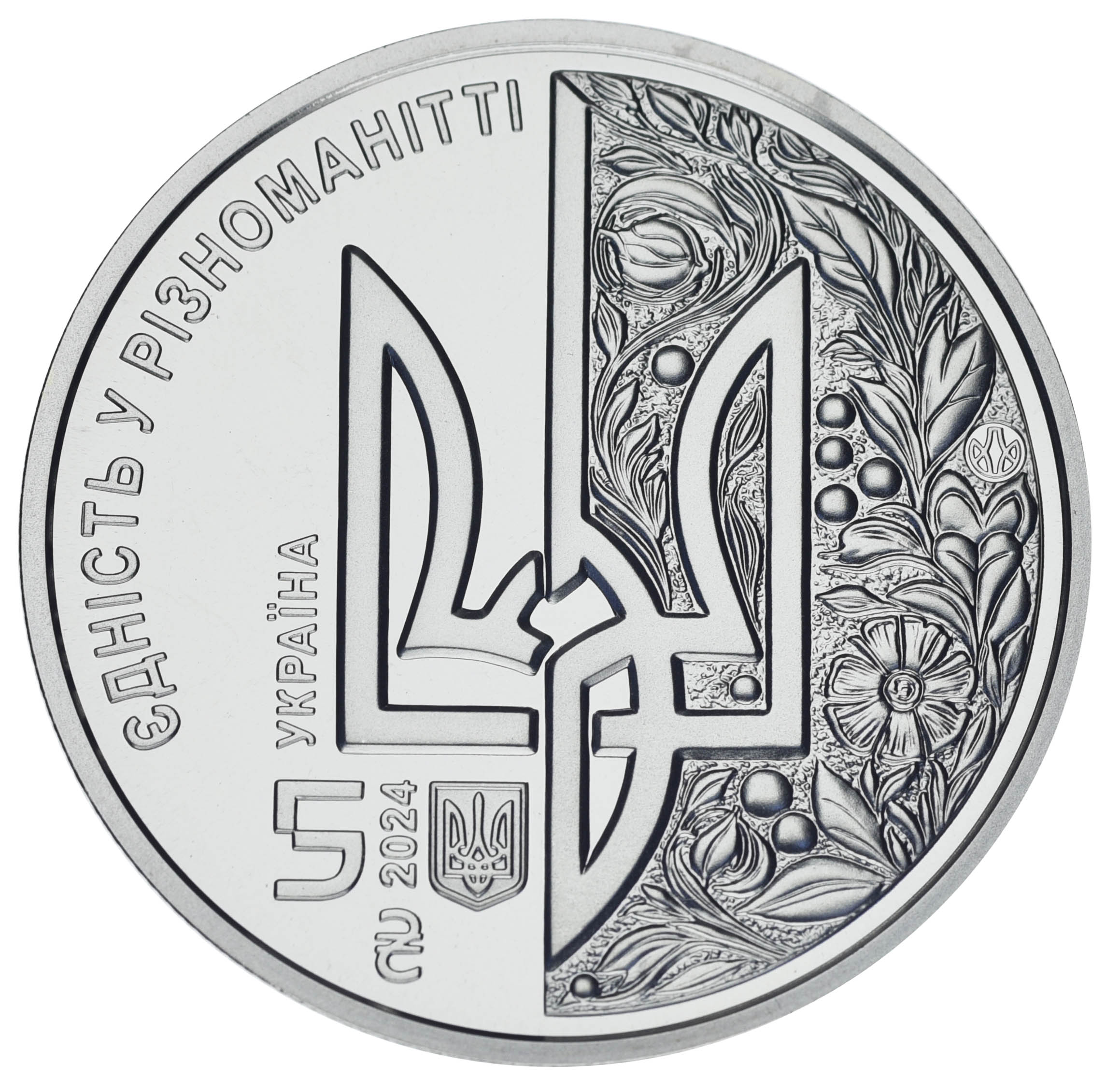 На аверсі монети по центру розміщено стилізований тризуб, символ України. Ліворуч від тризуба зображено офіційне гасло Європейського Союзу ЄДНІСТЬ У РІЗНОМАНІТТІ (угорі півколом) та напис УКРАЇНА (поруч із тризубом, вертикально). Унизу монети зазначено номінал 5 з графічним символом гривні, рік карбування – 2024 (вертикально) та малий Державний Герб України. Праворуч від тризуба зображено квітковий орнамент, який символізує процвітання та самобутню культуру держави, а також логотип Банкнотно-монетного двору Національного банку України.